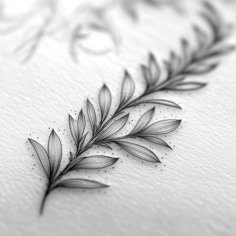AI-generated tattoo project concept presenting a delicate botanical motif: a slender stem of leaves drawn in fine lines with subtle dot shading. Rendered in black and grey, the piece relies on precise line work, negative space, and stippling to create texture without heavy fill, making it ideal for small tattoos or as a starting point for a larger body of work. The branch sweeps in a gentle arc, each leaf formed by delicate strokes and micro-dots that add depth and a sense of motion. This design speaks to the timeless appeal of botanical ink and sits comfortably within modern tattoo trends such as fine line tattoo, black and grey, and custom tattoo design, while nodding to Japanese and floral tattoo aesthetics through its restrained form. The motif is rich in meaning: leaves symbolize growth, renewal, and resilience, making the piece a meaningful tattoo option for personal milestones or spiritual journeys. The pattern-like rhythm of the repeated leaf shapes gives the design a cohesive, ornamental quality that can be extended into a sleeve or kept as a refined standalone statement. For ink application, the fine lines allow for clean healing and precision on various skin tones, and the dotted shading adds volume without overpowering the silhouette. As a concept, it invites personalization: scale, leaf density, and curvature can be adjusted to fit wrist, forearm, or behind-the-ear placements, while maintaining the same elegant aesthetic. This AI-generated tattoo project showcases how a simple botanical structure can become a sophisticated piece of body art, aligning with keywords such as tattoo, tattoo design, meaningful tattoos, fine line tattoo, flower tattoos, small tattoos, black and grey, realistic tattoo, and ink. It also signals its suitability for readers exploring cover-up options if darker elements are later introduced, given the design’s fluid lines and light shading.