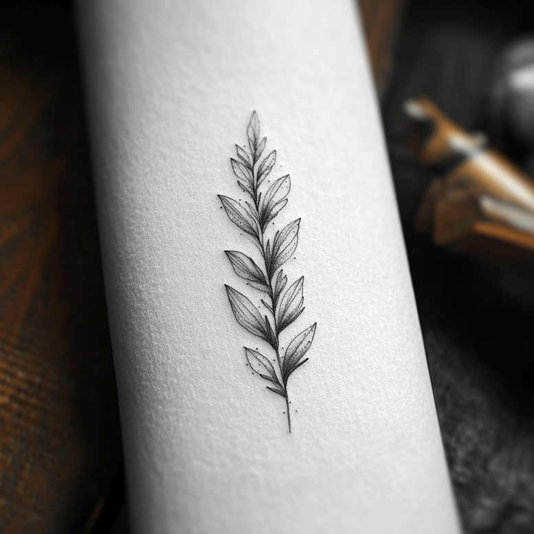 Rendered in a restrained black and grey palette, this delicate branch is executed with fine-line precision, featuring a slender stem and a steady procession of leaves that breathe along its length. Each leaf is defined by crisp contour lines, subtle stippling, and light shading that give a sense of depth without heavy fill; the overall effect is airy and elegant, ideal for a small tattoo on the forearm, wrist, or ankle, yet adaptable enough to extend into a larger botanical sleeve or a Japanese-style botanical motif if the client desires. The pattern-like repetition of leaves creates a quiet rhythm, emphasizing growth, memory, and personal resilience; the minimal design leaves ample negative space to preserve clarity over time, while the black ink ensures longevity and readability as the skin ages. While this is presented as a finished tattoo design, it’s also offered as an AI-generated tattoo project, representing a modern approach to body art that blends classic botanical symbolism with contemporary line-work. The piece can function as a stand-alone statement or as a building block for a custom tattoo design that integrates flower tattoos, fine line tattoo, and small tattoos concepts into a cohesive theme. If interpreted as part of a larger composition, the branch could connect with additional elements—flowers, stems, or abstract motifs—without compromising its legibility. In terms of symbolism, the branch with leaves evokes renewal, continuity, and the ongoing journey of life, making it a meaningful tattoo choice for anyone seeking subtle, sophisticated body art, and a versatile canvas for ink enthusiasts exploring black and grey, ink, and refined line techniques. As a design choice, it pairs well with negative space to maximize longevity and invites personalization through additional blossoms or companions like a tiny infinity or lotus motif in future iterations.