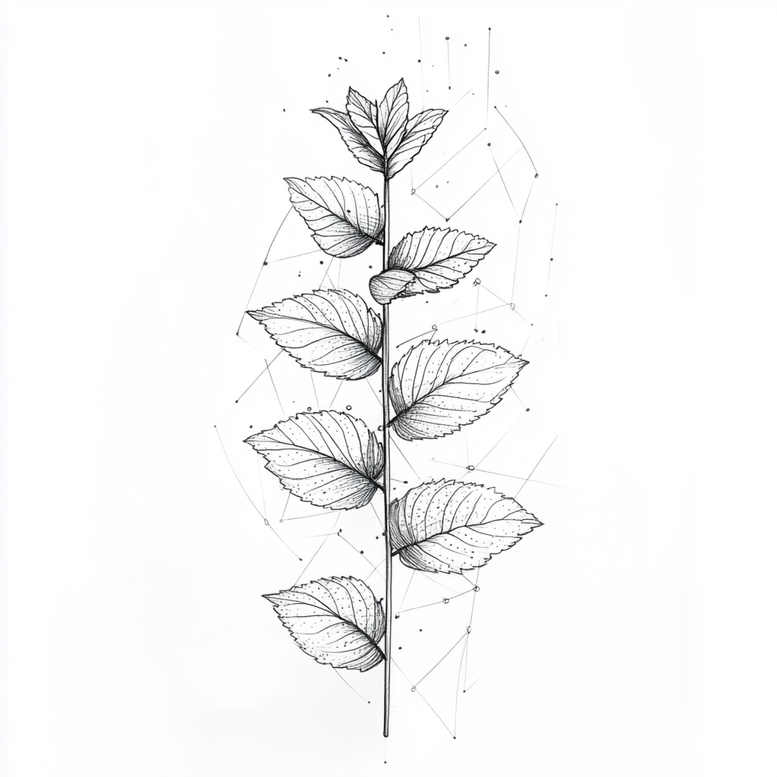 An elegant vertical botanical motif rendered in black and grey, this tattoo design pairs a slender stem with evenly spaced leaves, each leaf defined by fine line venation and subtle shading. The composition is augmented by a geometric lattice of lines and nodes that encircles and intersects the stem, creating a tension between organic growth and modern patterning. The leaves are shown in alternating orientation along the stem, with careful serration along the margins to convey surface texture. The background geometry appears as abstract, interconnected lines and dots, forming a delicate network that enhances depth without overpowering the plant motif. The technique relies on precise line work, negative space, and restrained shading to preserve the piece’s fine-line quality. This concept suits both small tattoos and larger works where a botanical element can be integrated with other motifs. For cover-ups, the vertical stem and surrounding geometry can be intensified or extended to mask previous ink, leveraging the pattern to conceal underlying designs. The design aligns with current trends in black and grey botanical tattoos and line work found in Japanese-inspired tattoo art, offering a clean, timeless option for meaningful tattoos. Symbolically, the stem signifies growth and resilience, while the leaves suggest renewal and balance, a reminder of nature’s persistence amid change. This AI-generated tattoo project aims to showcase a contemporary approach to botanical illustration, blending organic form with geometric precision for a sophisticated cover-up friendly option.