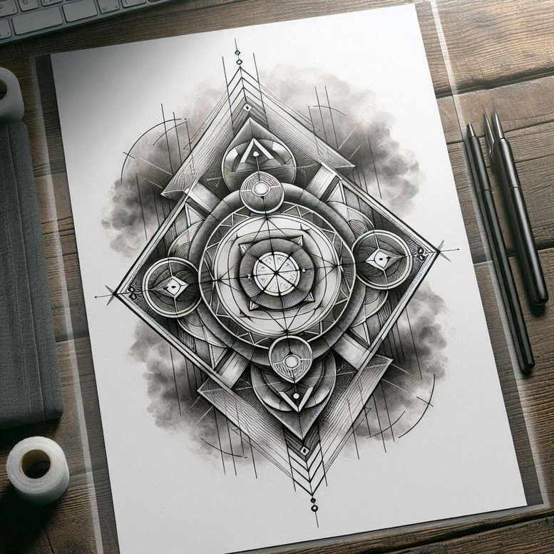 Geometric mandala composed of concentric circles, interlocking rings, and a central star-like core nested inside a rotated square frame. The design is rendered in black and grey with crisp fine-line precision, showing meticulous line-work, even stroke weight, and soft gradient shading that creates depth. The central motif is a multi-layered disk radiating outward through petal-like segments, while diamond shapes anchor the four cardinal directions and are connected by radial spokes that cross over each other to form complex tessellations. Smoke-like gray washes drift behind the geometry, suggesting atmosphere while preserving readability; the negative space around the composition is deliberate, giving the eye a resting area between dense clusters of lines. This piece reads as a versatile tattoo design that merges sacred geometry with contemporary vector-inspired aesthetics, suitable for small, medium, or as a launch pad for a larger sleeve. As an AI-generated tattoo project, it demonstrates how algorithmic prompts can yield intricate, scalable concepts ideal for adaptation onto skin, either as a standalone motif or as part of a broader body art narrative. It is particularly suitable for a cover-up thanks to its dense black shading and bold linework that can obscure older designs or scarring beneath the new ink. In technique, the artist employs layered linework, cross-hatching, and careful capillary shading to maintain legibility at varying sizes, while the central circle and surrounding ring systems convey symmetry and balance. Symbolically, mandalas symbolize unity, wholeness, and meditation; the interplay of circles, squares, and triangles hints at the harmony between spirit and form, making this a meaningful tattoo design choice for those pursuing personal symbolism. This concept also aligns with trends in black and-grey geometric tattooing, offering a crisp, durable silhouette that translates well into small tattoos and larger compositions alike. Keywords: tattoo, tattoo design, meaningful tattoos, fine line tattoo, lotus flower tattoo, infinity tattoo, tribal tattoo, rose tattoo design, small tattoos, flower tattoos, custom tattoo design, Japanese style tattoo, black and grey, realistic tattoo, body art, ink.