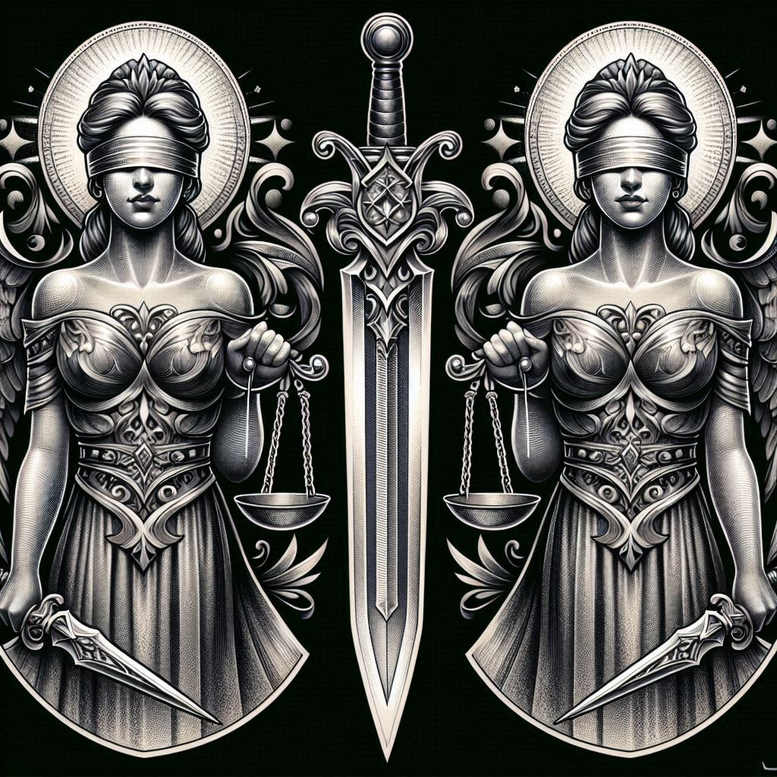 Drawing on Themis, the Greek goddess of justice and divine order, this tattoo concept reimagines the deity as twin guardians standing back-to-back around a central ornate blade. The composition is deliberately symmetrical, a classical device that communicates balance, impartiality, and the weighing of actions. Rendered in a black-and-grey palette, the piece relies on variegated shading to convey depth: glinting highlights along the sword, softened transitions on the armor, and subtle stippling in the fabric to evoke texture without overpowering line work. The two helmets and halos frame the stern visages of the goddesses, while the armor’s filigree repeats across both figures, creating a cohesive pattern that guides the eye in a circular motion toward the central weapon. This repeating motif lends a hypnotic, almost meditative quality to the design, underscoring the timeless message that law and order endure beyond fashion or momentary trend. In terms of meaning, the motif speaks to responsibility, integrity, and accountability; Themis stands for lawful judgment, and the dual figures symbolize the dual aspects of justice—duty and mercy—meeting at the sword that represents enforcement and protection of the innocent. From a tattoo design perspective, the strong linearity, high contrast, and precise shading suit larger placements such as the back, chest, or sleeve, where symmetry can be preserved. The style leans toward realistic black-and-grey illustration with ornamental, almost architectural detailing, perfect for those seeking a bold statement that doubles as meaningful tattoos and mythology-inspired body art. Although this is a designed concept, the piece is an AI-generated concept that translates ancient symbolism into contemporary ink, making it a flexible starting point for a custom tattoo design. Because the composition contains dense black areas and a dark ground, it is exceptionally well-suited for a cover-up, and the strong negative space around the central sword offers room for future adjustments or color accents. The artwork’s repeating patterns throughout the armor invite endless personalization, inviting the client to incorporate color or fine-line enhancements while maintaining the core mythic narrative, which will resonate with fans of myth-inspired tattoos and classical body art.