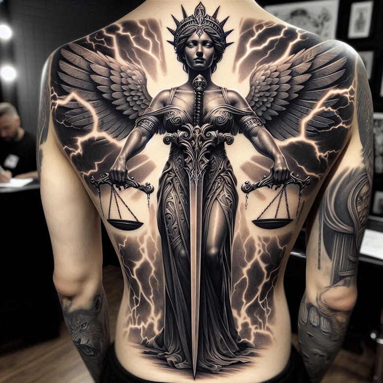 An imposing back piece, this Themis-inspired goddess tattoo design translates the divine authority of cosmic law into a contemporary study in black and grey realism. The central figure stands in a poised, authoritative posture, draped in a ceremonial robe and armored breastplate, while ember-like bolts of lightning frame her silhouette and fracture the surrounding space. The composition emphasizes symmetry and balance; the goddess holds stylized scales, symbolizing justice, equilibrium, and the cosmic order that governs both mortal and divine realms. Her wings extend outward as if guarding the bearer and suggesting ascent beyond chaos, while the robe’s etched texture and the metalwork on the armor are rendered with razor-sharp line work that creates tactile depth and a sense of weight. The lighting is meticulously modeled: deepest blacks anchor the form, mid-tones provide contour, and soft transitions yield a three-dimensional glow that reads clearly on the back when viewed from different angles. The Themis motif, rooted in Greek mythology, embodies fairness, accountability, and the rule of law, making this tattoo design a meaningful statement about virtue, responsibility, and balance in a modern life. The crown-like halo at the goddess’s head enhances the sense of sacred sanction, while the robe’s folds and the breastplate’s filigree nod to classical sculpture, giving the piece a timeless, mythic gravitas. The presence of lightning not only adds drama but also serves as a visual metaphor for clarity, truth, and the sudden illumination that justice can bring amid confusion. Executed as a full-back composition, the artwork uses negative space strategically to preserve breathing room and to magnify the central figure’s dominance; the surrounding bolts and shadowed edges intensify impact while keeping the design legible as the body moves. The piece works gracefully in black and grey, relying on high-contrast chiaroscuro to define form, movement, and mood, making it an ideal choice for anyone seeking a bold, iconic tattoo design with enduring meaning. This concept is AI-generated, illustrating how mythic symbolism can be translated into modern body art with careful attention to anatomy, proportion, and storytelling through ink. For clients considering a cover-up, the dense shading and broad planes provide excellent camouflage for older tattoos or skin imperfections, while preserving the goddess’s scales and regal presence. In terms of style, this design leans toward realistic black and grey realism, with subtle fine-line accents in the scales and halo that reward close viewing and elevate the work’s overall sophistication.