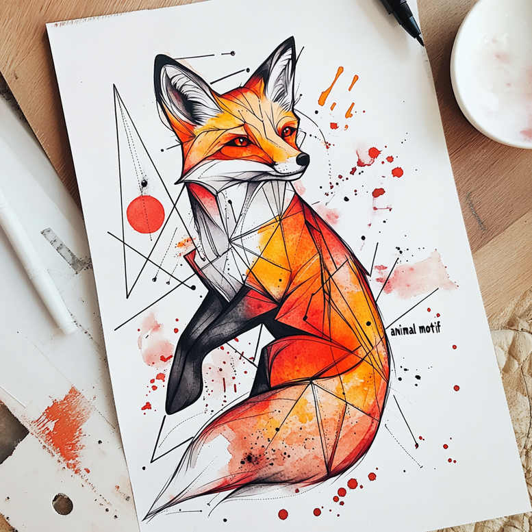 An AI-generated tattoo project concept that translates a fox into a fusion of realism and geometry. The composition centers on a fox seated in a poised posture, its form constructed from an interconnected web of straight lines and precise triangles that slice through negative space. Warm orange and scarlet watercolor washes fill the polygonal facets, lending vibrancy and movement against stark black linework. The contrast between the fluid painterly textures and crisp geometric geometry creates a study in balance, tempo, and silhouette, suitable for black and grey shading accents or as a vivid color piece. The design hints at symbolic themes of cunning, adaptability, and wilderness, with the fox’s gaze directed outward as if surveying a landscape. Subtle splatters and drips lend an organic feel to the piece, suggesting motion within a controlled framework. The setting on white paper creates a clean canvas that emphasizes line precision and bold color blocks, which translate well to tattoo skin when scaled properly. Practically, the piece champions a modern, fine-line aesthetic with geometric motifs and watercolor style, offering a versatile approach for small to medium tattoos. The approach nods to Japanese style tattoo lineage with clean linework and careful composition. When applied to skin, the pattern reads as a refined tattoo design suitable as a standalone motif or as part of a larger sleeve. Given its graphic nature, the project is well-suited for ink enthusiasts seeking a contemporary meaningful tattoo that blends nature with geometry; it also demonstrates how an AI-assisted workflow can inspire custom tattoo design processes in the field. In short, this is an AI-generated tattoo project that showcases a fox motif through pattern-based geometry and painterly color, a compelling option for a bold, dynamic body art piece that remains legible over time.