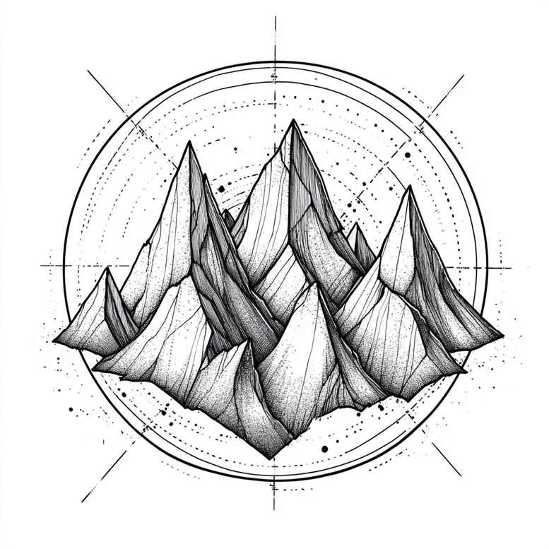 An AI-generated tattoo project presents a refined fine-line concept that renders a jagged mountain range inside a circular geometric frame. The composition relies on crisp black ink with light cross-hatching to create tonal variation rather than heavy shading, yielding a clean black-and-grey aesthetic suited to skin. The mountains rise with sharp, angular peaks, the ridges defined by careful line work that creates texture while preserving a minimalist, graphic feel. Surrounding the alpine mass is a layered circular motif: an outer ring punctuated by a dotted corona and subtle radial lines, evoking celestial maps and navigation charts. The interplay between negative space and line work gives the piece a balanced, almost mandala-like symmetry, making it highly adaptable for placement on the forearm, calf, or back. Symbolically, the mountains represent endurance and ascent, while the circle implies unity and the cyclical nature of journeys; the surrounding geometry amplifies the sense of direction and precision in a tattoo design that appeals to enthusiasts of meaningful tattoos and fans of geometric ink. The work functions as a concept for a custom tattoo design, aligning with modern body art sensibilities and the concise elegance of fine-line tattoo tradition. Because this is an AI-generated tattoo project concept, it should be treated as such; the crisp lines and scalable geometry offer a timeless black-and-grey motif with pattern-rich geometry that can be adapted for different placements while maintaining a professional magazine tone and SEO-friendly keywords such as tattoo, tattoo design, meaningful tattoos, fine line tattoo, lotus flower tattoo, infinity tattoo, tribal tattoo, rose tattoo design, small tattoos, flower tattoos, custom tattoo design, Japanese style tattoo, black and grey, realistic tattoo, body art, ink.