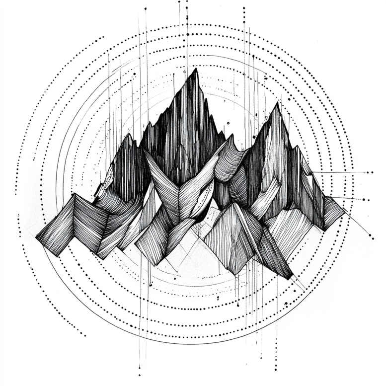 This is an AI-generated tattoo project concept that presents a geometric mountain landscape rendered in a fine line tattoo style. The composition fuses a jagged range of peaks with concentric circular rings and dotted dashes, creating a motion around a monumental horizon, all executed in black ink with precise line work that relies on negative space for depth. The mountains form a sturdy core—sharp ridges and angular faces—while the circular motifs frame the scene like a celestial map, inviting the eye to travel along the skyline. The piece balances natural form with abstract scaffolding, a combination that appeals to enthusiasts of fine line tattoos and geometric tattoos, and it scales well from small tattoos on wrists or ankles to larger canvases for body art enthusiasts. In terms of meaning, mountains symbolize endurance and ascent, while circles suggest cycles, unity, or celestial guidance, making this design meaningful for meaningful tattoos or as a personal symbol of growth. The black and grey aesthetic ensures crisp aging and versatile placement, and the minimalist shading keeps the piece readable on skin, suitable for classic ink lovers and contemporary collectors alike. As a custom tattoo design, it invites adaptation—consider adding lotus flower tattoos for balance, infinity motifs for continuity, or subtle Japanese style line work to honor tradition—without losing the clean, geometric essence. The concept demonstrates how algorithmic patterns can inform modern tattoo design while retaining the timeless appeal of mountain imagery, making it a compelling option in the broader landscape of tattoo art and ink.