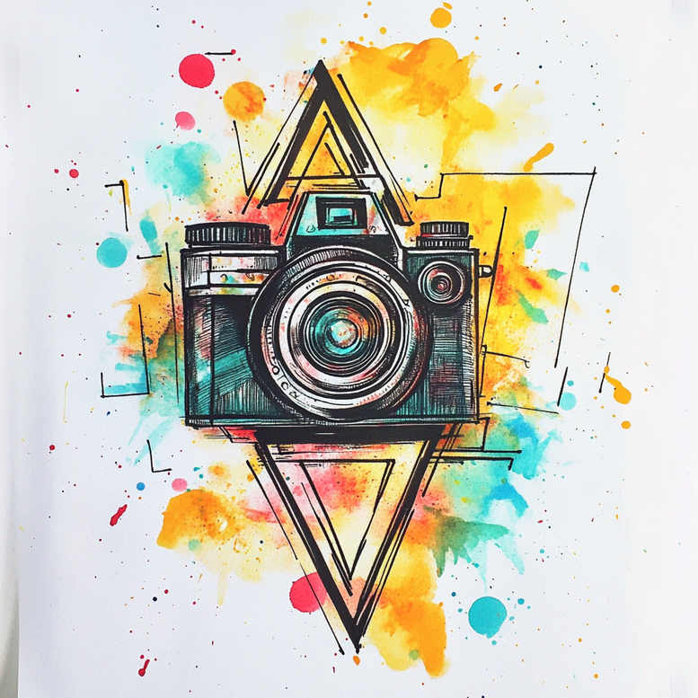 AI-generated tattoo project, this design pairs a detailed camera illustration with bold geometric triangles and a splash of watercolor. The central element is a vintage camera rendered in crisp black line work, its circular lens surrounded by stepped rings and metallic shading that gives a tangible, almost photographic presence. Framing the camera are overlapping triangles and a diamond-like outline that extend beyond the image, creating a contemporary motif that feels both architectural and organic. The splashes of color—turquoise, coral, lemon yellow, and soft pink—radiate outward from the camera, blending into the white skin like ink released on a canvas, with edges that blur slightly to mimic watercolor bleed. Technically, the piece relies on clean, confident lines for the camera and impasto-like color washes to convey depth and motion, a combination that straddles fine line tattoo sensibilities and more painterly approaches. The composition balances realism in the device with abstraction in the surrounding geometry, offering a reading that the camera is a portal to memory and storytelling. The color palette remains vibrant but controlled, ensuring legibility of the device while allowing the watercolor bursts to energize the design. From a symbolism standpoint, the camera speaks to captured moments, memory, and the art of observation, while the geometric frame suggests structure, balance, and the sequence of time. This design is suitable for a wide range of placements, including forearm, shin, or shoulder, and its high-contrast outline ensures good readability over time. In terms of tattoo design trends, it aligns with the growing appeal of pattern-rich, graphic colorwork that pairs a fine line approach with bold accents. If you’re exploring a custom tattoo design that marries photography iconography with modern geometry, this concept offers a dynamic and versatile option. It’s also an example of AI-generated tattoo projects that translate digital visuals into wearable ink while preserving the essence of hand-drawn detail. For collectors seeking meaningful tattoos, the camera motif represents memory and perspective, while the patterning adds visual energy and a contemporary edge, making it a striking choice for those who want a statement piece without excessive shading or a fully realistic render.