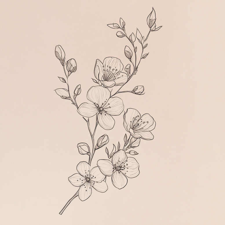 These are AI-generated tattoo projects featuring a refined linework study of a branch with blossoms. The composition follows a sinuous stem that ascends diagonally, with open blossoms and tight buds along the branches, complemented by slender leaves. Executed in clean black ink with a fine-line technique, the sketch relies on controlled line weight and sparing shading to convey delicate texture and a sense of movement. The design emphasizes generous negative space around each blossom, creating an airy feel that works well as a small tattoo or as part of a larger piece. The focal flowers resemble cherry blossoms, whose symbolism centers on renewal, fleeting beauty, and new beginnings, making this a meaningful tattoo design for someone drawn to a gentle, nature-inspired motif. The curvature of the branch allows it to wrap along a forearm, ankle, or collarbone, offering flexible placement options without overwhelming the surrounding skin. Rendered in monochrome black and grey, the work prioritizes clarity of line and contrast, ensuring legibility on light to medium skin tones and easy adaptation for future ink edits or additions. As an AI-generated concept, this tattoo project demonstrates how botanical linework can translate into refined body art, preserving the elegance of botanical illustration while maintaining a minimalist aesthetic suitable for modern tattoos. The absence of heavy shading also makes it ideal for clients seeking meaningful tattoos with subtle detail that ages gracefully. While the piece is designed with natural realism in mind, the linework remains stylized enough to suit various personal interpretations, from a singular statement on the wrist to a cascading sleeve motif. In essence, this tattoo design blends botanical realism with a disciplined line approach, offering a timeless option for flower tattoos, fine-line ink, and custom tattoo design that can be realized in black and grey as a versatile, personal body art statement.