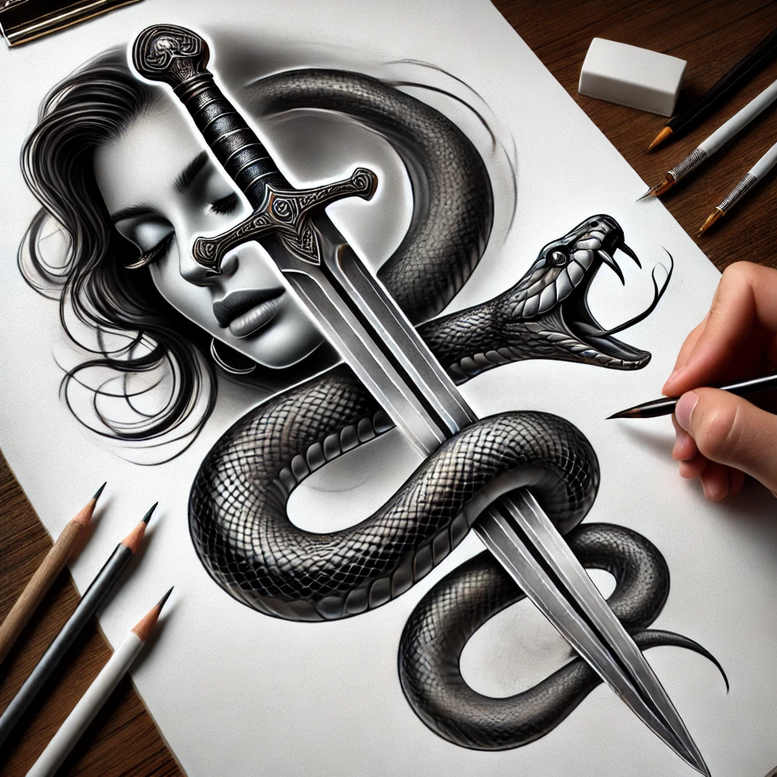 This is an AI-generated tattoo project that explores a dramatic black and grey realism concept: a dagger piercing a woman’s portrait while a snake coils around the blade. The composition uses chiaroscuro shading to render lifelike skin tones, scaly texture, and metallic gleam, with careful emphasis on light and shadow to create depth. A coiling serpent wraps the central element and the blade cuts through the facial silhouette, suggesting conflict, rebirth, and protection. The surrounding workspace elements such as pencils and an eraser imply a study phase, while the focal moment remains a bold fusion of weapon, serpent, and face. The design can be adapted for placement on the forearm, calf, or back, and the black and grey palette makes it particularly suitable for a cover up on darker skin tones. The pattern of snake scales provides rhythmic texture that guides the eye along the blade and through the portrait, while the woman’s gaze adds emotional resonance and a narrative layer to the tattoo design. This concept works well as a meaningful tattoo, a statement piece for body art, or a custom tattoo design that can be tailored with minor adjustments to line thickness and shading. In the broader context of tattoo art, it resonates with themes of transformation, struggle, and resilience and aligns with keywords such as tattoo, tattoo design, meaningful tattoos, fine line tattoo, lotus flower tattoo, infinity tattoo, tribal tattoo, rose tattoo design, small tattoos, flower tattoos, custom tattoo design, Japanese style tattoo, black and grey, realistic tattoo, body art, ink. If the image is very dark, the composition remains well suited for a cover up, with strong contrast and edge definition that can be used to mask underlying marks.