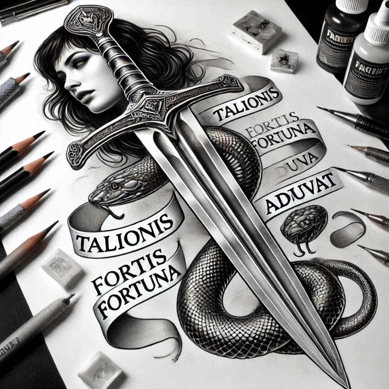 This is an AI-generated tattoo project presented in a high-contrast black-and-grey style. The composition centers on a long sword driven downward, its blade and hilt rendered with meticulous shading. A dark, coiled snake wraps around the blade, its scales crafted with fine line work to create a tactile texture. Behind and above the weapon, a woman’s face emerges in grayscale, providing a portrait focal point that adds emotion and depth. A flowing ribbon winds around the central elements, bearing Latin motto text that adds movement and narrative meaning. Additional studio props—pencils, ink bottles, and erasers—are rendered on the page, emphasizing that this is a concept drawing translated into body art. The artist uses dense blacks and smooth gradient transitions to achieve a realistic, ink-rich appearance suitable for a bold tattoo design. The piece blends classic motifs often found in traditional and Japanese-inspired tattoo art with contemporary realism, resulting in a unique custom tattoo design that works well as a larger back piece, chest, or sleeve. Symbolically, the sword represents protection and courage, the snake suggests transformation, and the Latin ribbon hints at fate and fortune, offering meaningful tattoos that invite personal interpretation. The careful arrangement of foreground elements against a lighter background creates strong contrast that translates well into skin, while the pattern elements—snake scales and ribbon folds—add texture and rhythm. This project is designed for cover-up use, with dense shading and overlapping forms that can obscure previous tattoos while preserving legibility of the new piece. Key techniques showcased include black and grey shading, fine line tattoo accents, and controlled negative space to maintain clarity at various scales; it’s an ideal reference for those seeking a realistic tattoo with dramatic impact, a strong example of tattoo design, and an AI-generated tattoo project that can inspire commissions and adjustments for a bespoke ink.