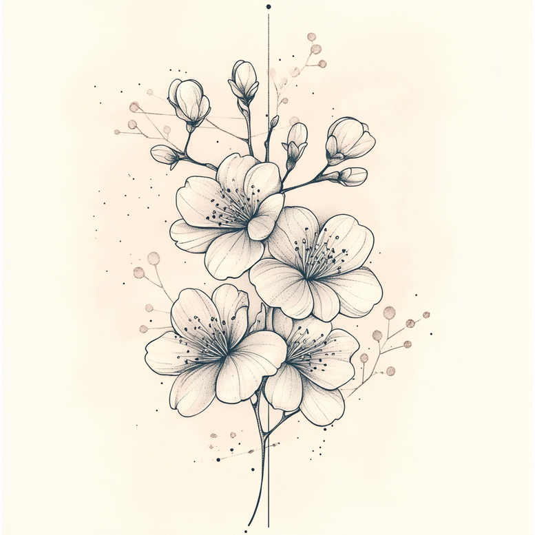 This botanical study presents a refined, black-and-grey fine-line tattoo design of a vertical cherry blossom bouquet. The composition centers on a slender stem supporting a cluster of five to six blossoms, rendered with delicate petals and subtle stippling at the stamen to suggest texture and depth. Branches extend upward with small buds and fine twigs, while trailing splatters and tiny dots give an airy, almost watercolor feel without breaking the line-work. The piece balances negative space with precise line work, allowing the blossoms to breathe on the skin and providing a versatile option for placement along the forearm, ribs, or back. Technique-wise, the artist uses clean micro-lines, light shading, and restrained stippling to achieve a realistic yet stylized blossom look. The overall tone is restrained and elegant, characteristic of a black-and-grey tattoo with a focus on form rather than mass. The design reads as a timeless floral motif—flowers symbolizing renewal, beauty, and growth—while the tall stem and branching arrangement yield a sense of upward movement. For collectors seeking meaningful tattoos, this piece fits well as a standalone image or as a starting point for a custom tattoo design that could be expanded with leaves, additional branches, or a complementary companion motif. While the design leans toward Japanese-style botanical illustration in its clean lines and balanced composition, it remains adaptable to various tattoo styles, from fine-line to realistic black-and-grey. The artwork was generated as an AI-generated tattoo project, offering a ready-to-ink concept that preserves the essence of hand-drawn floral line-work. If the client desires refinements, the pattern and symmetry can be adjusted to suit individual anatomy, ensuring a comfortable fade and long-term readability. In all, this black-and-grey cherry blossom bouquet stands as a meaningful, elegant choice for small-to-medium tattoos, inviting personalization while maintaining a strong graphic presence. lotus flower tattoo symbolism, infinity tattoo ideas, tribal tattoo aesthetics, rose tattoo design potential, small tattoos, flower tattoos, custom tattoo design, Japanese style tattoo, ink.