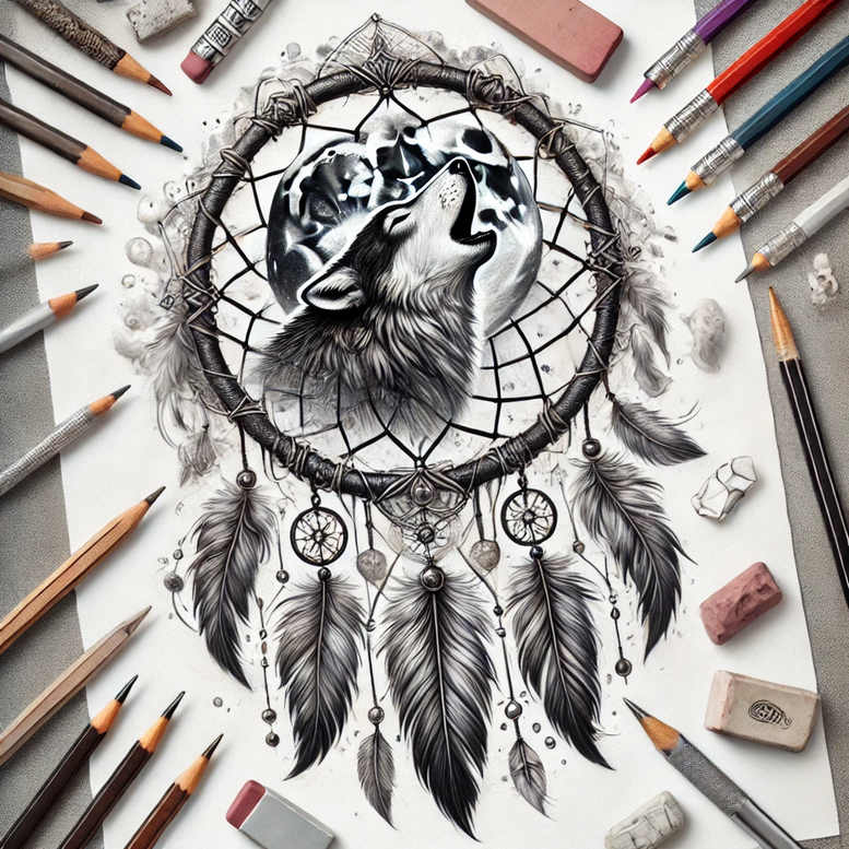 This black and grey tattoo concept pairs a howling wolf with the circular web of a dreamcatcher, rendered in a highly realistic style that reads as a complete body art proposition. The wolf’s fur is built with careful gradations of shade to emphasize the muscle, texture, and sense of motion, while the dreamcatcher’s web carries a geometric rhythm that anchors the design. Long, slender feathers descend from the hoop, each feather rendered with fine line detail, subtle shading, and tiny beads that catch light and break up negative space. The composition uses the circle as a focal frame, allowing the eye to follow the arc from crown to tip, making it suitable for a shoulder, sleeve, or back piece. The surrounding pencils and erasers in the image underscore its nature as a concept drawing, yet the artwork translates confidently to skin as a tattoo design that balances bold silhouette with delicate nuance. As an AI-generated tattoo project, this concept functions as a strong reference for a custom tattoo design that prioritizes contrast, line integrity, and longevity in black and grey ink. Symbolically, the wolf evokes loyalty, guardianship, and instinct; the dreamcatcher signifies protection against negative dreams and energy; feathers symbolize truth and connection to the spiritual world. Collectively, the piece carries a meaningful narrative that can be adapted into several styles, from traditional tribal to modern Japanese-influenced tattoo aesthetics, while preserving the core story. For those seeking meaningful tattoos, this design offers flexibility for a small piece or an expansive composition, combining a realistic animal portrait with a culturally resonant motif to create a striking, timeless tattoo design that remains legible on the skin and works well as a stand-alone image or a centerpiece within a larger sleeve or back panel.