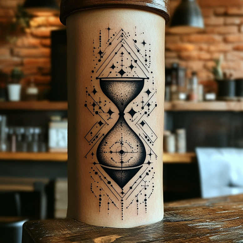 AI-generated tattoo project presents an hourglass-centered design rendered in black and grey dotwork and geometric linework. The central hourglass dominates the composition, its sand tapering at the waist with a stippled gradient that adds depth. Surrounding it, a lattice of diamonds and angular frames is linked by fine lines and dotted accents, forming a dense, symmetrical pattern that reads as both architectural and decorative. The dotwork variation creates texture and a sense of movement, while negative space keeps the piece readable on forearms or calves. Symbolically, the hourglass stands for time, change, and continuity, with geometric motifs implying order and connection. The overall aesthetic bridges traditional dotwork with precise linework, delivering a bold, contemporary tattoo design suitable for meaningful tattoos and personal symbolism. The dense black ink and structured pattern render this concept an excellent candidate for a cover-up, capable of obscuring older imagery beneath a cohesive, high-contrast body art piece. This concept demonstrates how AI-generated tattoo projects can inspire custom tattoo design that blends symbolism with decorative patterning, preserving legibility and impact across sizes. For artists, adjustments to line weight, dot density, and spacing can tailor the piece to skin tone and placement, ensuring a durable, timeless tattoo in black and grey, with echoes of Japanese style tattoo and classic ink traditions. AI origin note: this is an AI-generated tattoo project. In practice, the motif can be adapted to small tattoos or larger sleeves; the geometry anchors composition and aids aging, while remaining a versatile body art design suitable for ink, meaningful tattoos, and personal expression.