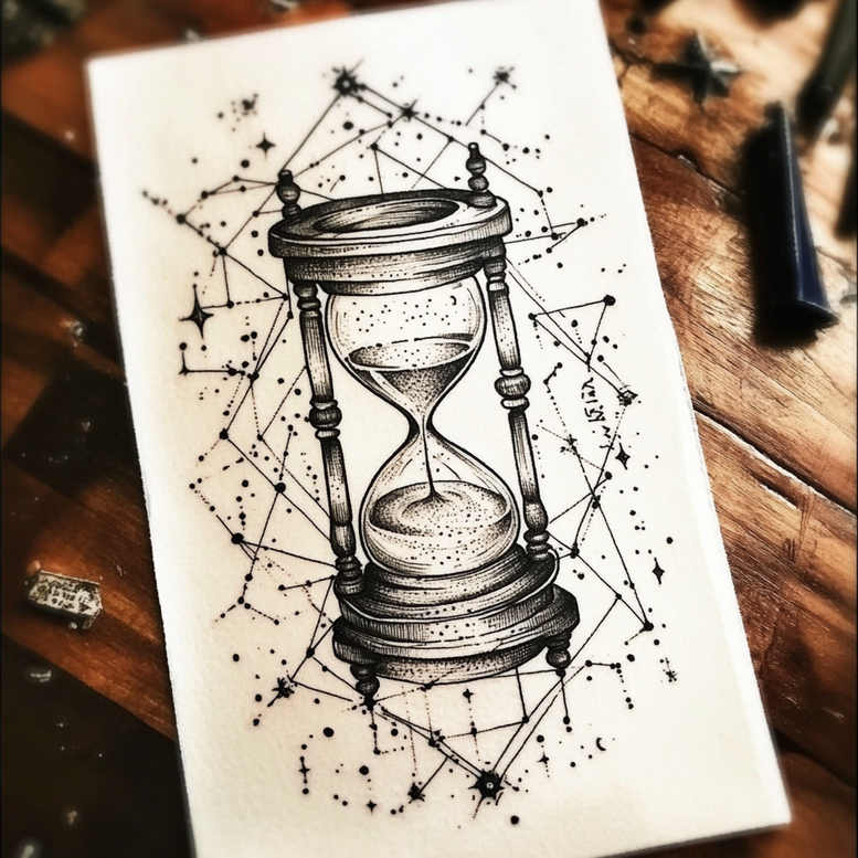 An intricate hourglass tattoo concept sits at the center of a celestial web, its glass bulb shaded with stippled black and grey ink while the surrounding mantle is formed by a constellation of dots and straight lines. The composition fuses classical symbolism of time and fate with modern geometric patterning, turning a simple measure of moments into a meaningful tattoo design. The hourglass figure anchors the piece, its column legs rendered with fine line precision, while the sand within flows in a gentle hourglass curve that mirrors the surrounding star points. The constellation lines connect the star-like dots, creating a delicate lattice that breathes life into the negative space around the hourglass. This pattern-rich design emphasizes a sense of cosmic balance, with sparkles and tiny diamonds scattered like distant galaxies. Technique-wise, the artist uses a fine-line approach: crisp outlines, restrained dot shading, and subtle stippling to create dimensionality without heavy shading. The black and grey palette keeps the piece versatile across skin tones, making it suitable for a wide range of placements on the body. The motif invites personal interpretation: time as a reminder to value fleeting moments, the stars as guidance, and the geometric grid as a map of intention. In addition to the hourglass, the patterning evokes both nature and technology, offering a contemporary take on traditional tattoo symbolism. This description uses a modern, magazine-like tone to present a potential tattoo design that would appeal to fans of meaningful tattoos, fine line tattoo, and Japanese-style influences in black and grey ink. As AI-generated tattoo projects, these designs offer a fresh, precise rendering of a classic motif that can be tailored into a custom tattoo design for small tattoos or larger banners on the forearm or back. The piece embodies body art that is both decorative and symbolic, bridging timeless imagery with the current demand for clean geometry and ink purity, while maintaining a strong emphasis on the craft of line work and dot work that defines the pattern-driven aesthetic.