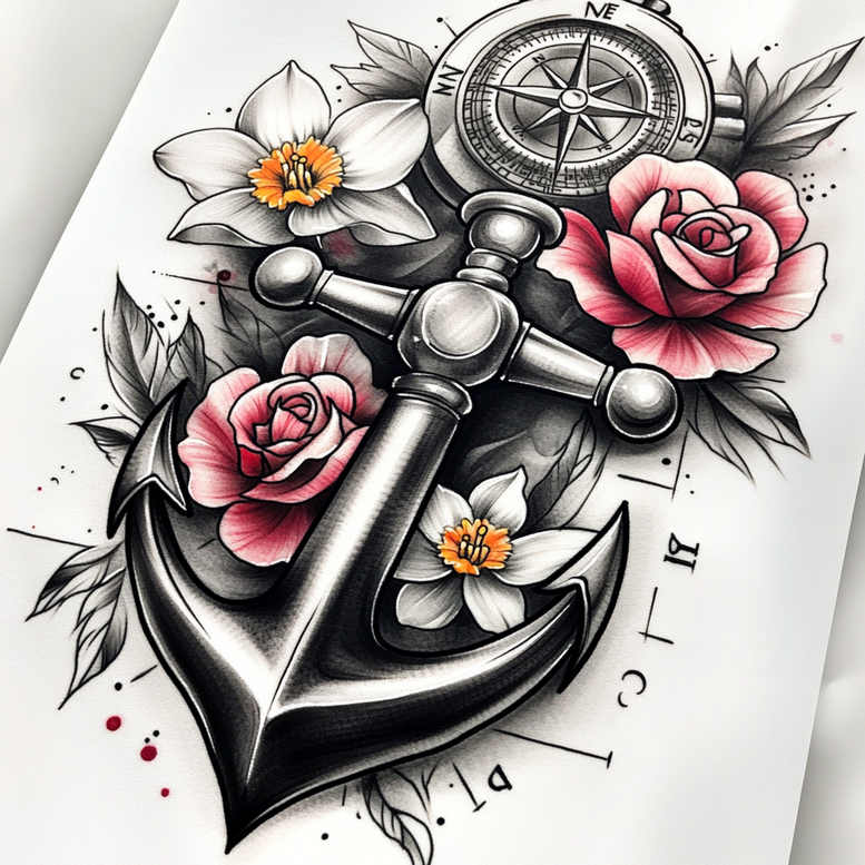 This AI-generated tattoo project concept presents a bold anchor intertwined with a maritime compass, framed by pink roses and white daffodils. Executed in black and grey with selective color, the piece blends graphic line work with soft shading to create a balanced composition that reads clearly at various skin tones and sizes. The anchor symbolizes stability and resilience, while the compass suggests direction and purpose; the roses add romance and vitality, and the white daffodils introduce brightness and contrast. The design emphasizes clean negative space and layered textures, allowing it to adapt well to placements such as the forearm, shoulder, or calf. Although richly contrasted, the scheme remains versatile for full color or monochrome executions, and its dense dark areas make it particularly suitable as a cover-up for existing work, as the black shading can mask underlying ink. This concept aligns with trends in realistic and traditional tattoo design, bridging black and grey realism with floral elements. The piece can be refined into a larger composition or scaled down into a small tattoo without losing the dynamic interplay between the anchor, compass, and flora. For collectors seeking meaningful tattoos, this concept conveys guidance, fidelity, and growth; for those pursuing a Japanese-style or neo-traditional aesthetic, the bold lines and shading can be adapted while preserving a classic vibe. In terms of technique, the tattoo would combine crisp outlines with smooth gradients, subtle stippling in shadowed areas, and selective color on the roses to maintain depth. As an AI-generated concept, it demonstrates how modern ink projects translate nautical and floral motifs into a cohesive body-art statement, ready for customization by a skilled artist. Overall, this is a versatile, cover-up-friendly tattoo design that melds realism with symbolic flora, ideal for ink collectors and enthusiasts alike.