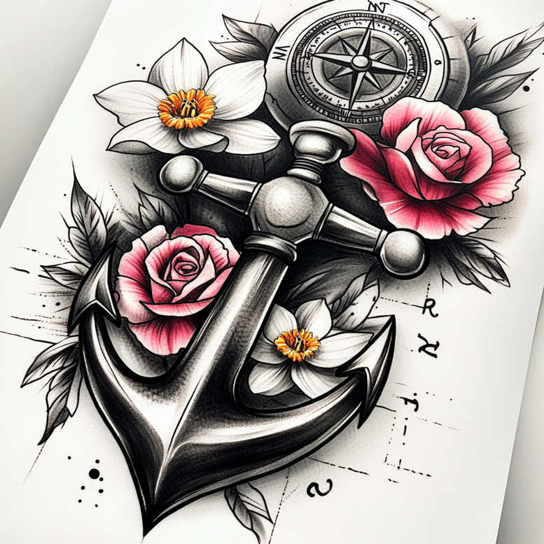 AI-generated tattoo project. This design pairs nautical and floral elements in a cohesive composition: an anchor and a compass rise behind a bouquet of roses and narcissus, with leaves weaving through the scene. The anchor sits in the foreground with a bold, curved fluke, while a circular compass adds a sense of direction and journey. Pink roses contrast with white narcissus, their petals rendered in subtle gradients and orange centers adding warmth. Black and grey shading grounds the piece, while carefully applied color on the blossoms creates focal points and depth. The technique blends traditional bold outlines with realistic shading, producing clean lines that age well and a sense of volume on metal and petals alike. Symbolically, the anchor signifies stability, the compass guidance, and the roses and narcissus beauty, resilience, and renewal—making it a meaningful tattoo design for those who value travel, growth, or personal milestones. This project showcases how a custom tattoo design can merge different motifs into one harmonious narrative suitable for forearm or calf placement, with flexibility to scale and adapt line work. Though AI-generated, the concept demonstrates how modern ink projects can translate iconography and nature into an expressive body art piece. In full color, the composition remains legible and balanced, preserving high-contrast edges while allowing blossoms to glow against shaded metals.