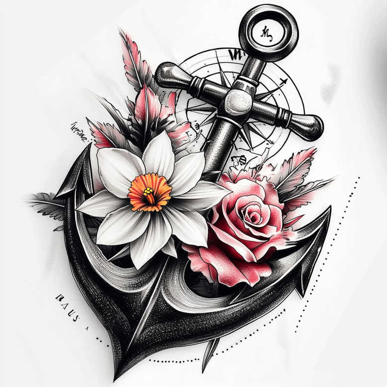 This tattoo design pairs a bold black anchor with two florals—a white daffodil and a pink rose—set against a subtle compass motif and circular geometry. Rendered in black and grey ink, the piece relies on confident line work, smooth gradient shading, and light stippling to create depth while preserving readability on smaller skin areas. The anchor grounds the composition, symbolizing steadfastness and protection, while the daffodil signals renewal and new beginnings, and the rose adds romantic luminosity. The compass behind it all suggests direction and journey, with the circular geometry forming a quiet pattern that ties the elements together. Leaves and dotted accents frame the scene, giving a graphic edge suitable for both realistic tattoo work and more stylized interpretations. This design is versatile for forearms, shoulders, or calves, balancing nautical symbolism with botanical beauty in a way that suits contemporary body art. The image is an AI-generated tattoo project, reflecting current approaches to ink and design. Because of the dense blacks and contrast, it’s a strong candidate for a cover-up, retaining the floral highlights while masking underlying work. The composition uses negative space to ensure legibility and flow when scaled, and its pattern-like circle and dot motifs help unify the composition across sizes. For meaning, the piece speaks to resilience, growth, and life’s journeys, while offering enduring motifs—anchor, rose, and floral line work—that work well in rose tattoo design, flower tattoos, and black and grey tattoo repertoires. It nods to Japanese-style balance and modern tattoo language, making it a robust option for a meaningful tattoo in a compact or mid-size footprint.