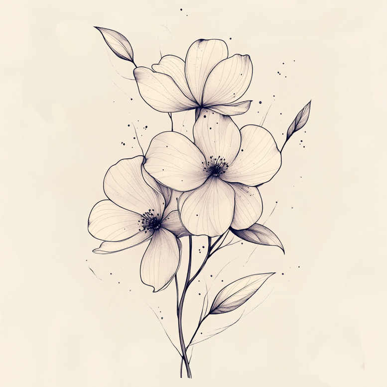 This botanical tattoo concept renders a trio of blossoms in a light, airy composition executed with fine-line precision. The central stem branches to cradle three open flowers, each petal shaped with slender, feather-like strokes that suggest movement and growth. Leaves extend along the stems, their tips tapered and shaded with soft gradients to add depth while keeping the piece in black ink on a pale canvas. Tiny splatters around the blossoms evoke a touch of spontaneity, elevating the natural feel without overpowering the clean silhouette. The ink distribution remains restrained, emphasizing negative space and the clarity of linework—ideal for a timeless tattoo design. Though minimalist, the composition carries meaning: renewal, resilience, and the quiet beauty of nature captured as a personal body art statement. The fine-line approach yields a delicate appearance that ages gracefully, making it suitable for small to medium placements on the arm, shoulder, or neck. The concept can be adapted to personal preferences, with more or fewer blooms, alternate leaf shapes, or subtle adjustments to line weight while preserving the elegant aesthetic. This project is presented as an AI-generated tattoo concept, illustrating how artificial intelligence can inspire tattoo studios and clients seeking refined floral ideas. In the broader context of meaningful tattoos, floral designs continue to resonate for their universal symbolism and timeless appeal, particularly when rendered in black and grey linework that emphasizes form over fill. It aligns with trends in Japanese-style botanical tattooing and modern fine-line traditions, offering a versatile option for both first-time wearers and seasoned collectors.