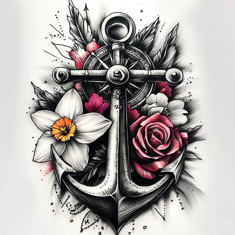 This tattoo concept blends nautical symbolism with botanical detail in a restrained black and grey, fine-line aesthetic. The composition centers on a sturdy anchor intersected by a ship wheel, with a rose and a white daffodil weaving through the steel and spokes. Crisp line work defines each contour, while soft gradients build volume across the shaft of the anchor and the rim of the wheel. Select color touches—pink on the rose, pink bloom, white petals, and yellow centers—offer focal points without overpowering the monochrome core, preserving readability on larger canvases and over time on skin. Symbolically, the anchor conveys steadfastness and direction, the wheel represents navigation and fate, the rose speaks to love and resilience, and the daffodil signifies renewal—together they form a narrative about overcoming storms and embracing growth. The design reads as a realistic tattoo with a hint of illustrative line work, suitable for a range of placements from forearm to chest or back; it also lends itself to customization into Japanese-inspired, tribal, or lotus-flower variations while maintaining the primary motifs. As an AI-generated tattoo project concept, it showcases how modern shading techniques and bold silhouettes can be integrated with traditional sailor iconography to produce a meaningful tattoo design that appeals to lovers of fine line tattoo and black and grey realism. For clients seeking a custom tattoo design, the piece emphasizes clean ink lines, durable contrast, and flexibility for cover-up applications. Given the dark massing around the anchor and wheel, this composition is particularly well-suited as a cover-up option for older work, delivering a timeless silhouette with added depth, texture, and life.