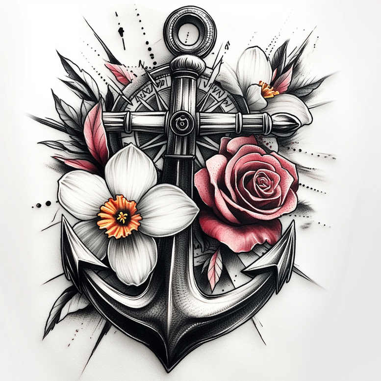 This AI-generated tattoo project presents a bold neo-traditional composition that fuses nautical symbolism with floral elegance. The central anchor dominates the design with a circular stock ring and stout crossbars, rendered in black and grey through crisp linework and smooth gradient shading to evoke a metallic feel. Surrounding the anchor, a pink rose and a white daffodil with orange centers rise in counterpoint, their petals crafted with deliberate highlights and soft transitions to preserve a graphic silhouette suitable for skin while offering lifelike texture. Leaves weave through the composition, creating negative space and a sense of motion, while splashes of ink and fine micro-details radiate outward to add energy without crowding the focal points. The technique pairs bold outlines with restrained shading and subtle dotwork, producing depth and a timeless look that works well on forearms, shoulders, or upper backs. Color is used selectively: the rose and daffodil receive accent hues while the anchor and foliage remain in grayscale, emphasizing focal points and ensuring compatibility with black and grey ink over time. Symbolically, the anchor represents stability and steadfastness, the rose conveys resilience and passion, and the daffodil signals renewal and hope, forming a cohesive narrative of strength and beauty. As an AI-generated tattoo project, this design demonstrates current trends in tattoo art—clean geometry, lucid contrast, and a harmonious blend of realism and graphic clarity—while remaining a versatile blueprint for a custom tattoo design. For clients seeking meaningful, classic body art, this piece offers a refined option that balances masculine nautical imagery with feminine florals, a suitable choice for those who value both style and symbolism. The concept can be scaled or adjusted in line weight and color intensity to fit different placements, from sleeves to small panels, while maintaining legibility and impact in a professional tattoo setting.