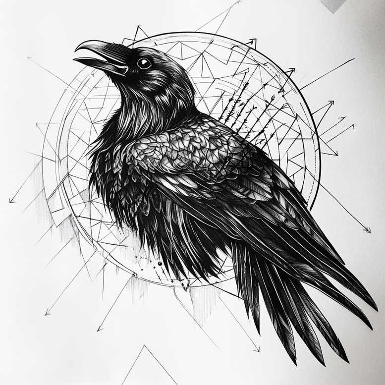 This AI-generated tattoo project features a bold raven perched within a geometric circle, surrounded by intersecting lines and arrowed rays. Executed in black and grey, the piece relies on strong contrast, clean linework, and layered shading to convey texture in the raven’s feathers and the intricate geometric backdrop. The raven serves as the hero motif, symbolizing intelligence, mystery, and transformation, while the circle and spokes evoke unity and continuity; the arrows imply direction and momentum. The design leans toward fine line tattoo and graphic linework, with solid blacks, micro-shading, and deliberate negative space to preserve readability on the skin across different scales. For practitioners, the piece offers a striking, high-contrast option that is especially suitable as a cover-up due to its dense blacks, bold silhouettes, and complex internal textures. The observed geometric pattern around the circle creates a modern tattoo design with a dynamic edge and a sense of motion, easily adaptable to Japanese style tattoo influences or kept in a contemporary black and grey aesthetic. As a meaningful tattoo concept, it pairs well with lotus flower tattoo or rose tattoo design in larger back or sleeve compositions, and it can be integrated with infinity tattoo elements or tribal tattoo motifs for a custom tattoo design. The raven motif can carry personal symbolism such as resilience, intellect, or metamorphosis, making this design attractive for meaningful tattoos and small tattoos that transition into larger pieces. From a micro-tattoo on the forearm to a more expansive back piece, the geometry, line density, and shading balance provide versatility; the meticulous patterning ensures legibility over time, while the ink density supports longevity and a crisp black silhouette. This project demonstrates how geometric patterning can elevate a traditional raven motif into a contemporary body art piece, aligning with current trends in black and grey ink, realistic tattoo shading, and custom tattoo design; it remains a strong option for those seeking a powerful design with cover-up potential. Note that this is an AI-generated tattoo project, illustrating how algorithmic guidance can inform bold, high-contrast tattoos.