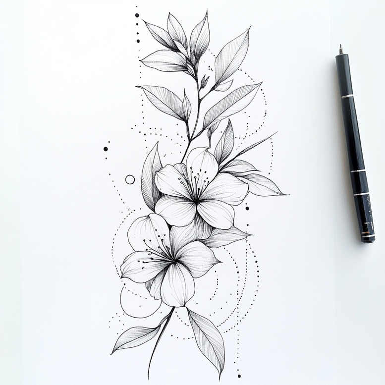 Rendered in black and grey, this fine line tattoo concept presents a vertical cluster of two blooming flowers along a slender stem, with gracefully arching leaves that frame the composition. The line work is precise and restrained, emphasizing clean contours and delicate petal structures; subtle shading within each bloom adds a sense of depth without overpowering the overall light aesthetic typical of fine line tattoos. Surrounding the blossoms are circular dot patterns and scattered stippling that create a subtle orbital motion, giving the piece a contemporary graphic rhythm while still anchoring it in botanical realism. The negative spaces are deliberate, allowing the skin to breathe between elements and making the design easily adaptable to various placements—from a small to medium tattoo or as a refined accent in a sleeve or back piece. Symbolically, flowers convey growth, renewal, and the beauty of fleeting moments; pairing two blooms can represent partnership, balance, or evolving stages of life. The composition benefits from versatility: it can be scaled up for a more dramatic effect, simplified for a minimalist tattoo, or reimagined with Japanese-influenced line clarity or a slightly darker black-and-grey palette for additional contrast. The dotted arcs also invite pattern-oriented applications, enabling a cohesive sleeve or back panel when repeated or extended. This is an AI-generated tattoo project concept, useful for artists seeking to translate digital idea into ink, while remaining compatible with many stylistic directions—from realistic to ornamental. For tagging, envisage keywords such as flower tattoos, fine line tattoo, black and grey, pattern, and custom tattoo design to optimize discoverability in portfolios and search engines.