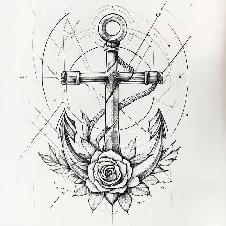This tattoo design merges nautical symbolism with floral grace in a clean black and grey, fine line style. The central anchor stands bold and upright, its shank intersected by a rope that winds around to form subtle spirals, while a rose sits at the base in full bloom. Leaves extend outward to frame the composition, adding natural movement without crowding the main imagery. Surrounding the backbone of the motif are geometric circles and linear arcs that introduce a modern pattern to a traditional subject, creating a balanced interplay between rigidity and organic form. The line work emphasizes contrast: crisp outlines and soft shading deliver depth and readability whether the piece is rendered small or scaled up. This tattoo design communicates resilience through the anchor, devotion through the rose, and connection through the rope, offering multiple layers of meaning suitable for meaningful tattoos in a custom tattoo design. The geometric patterning gives the piece a contemporary edge, appealing to fans of Japanese style tattoo influences fused with Western sailor imagery. As an AI-generated tattoo project, the concept showcases how algorithmic drafting can yield ready-to-ink compositions that tattoo artists can refine with line weight, shading, and placement to suit a client’s body art goals. The design remains versatile for placement on forearm, calf, or shoulder, and its clear silhouette makes it a strong candidate for a cover-up if the client wishes to obscure previous marks larger-scale ink over time. In short, this piece blends classic symbolism with geometric aesthetics, delivering a tattoo design that is timeless, meaningful, and visually striking in black and grey.
