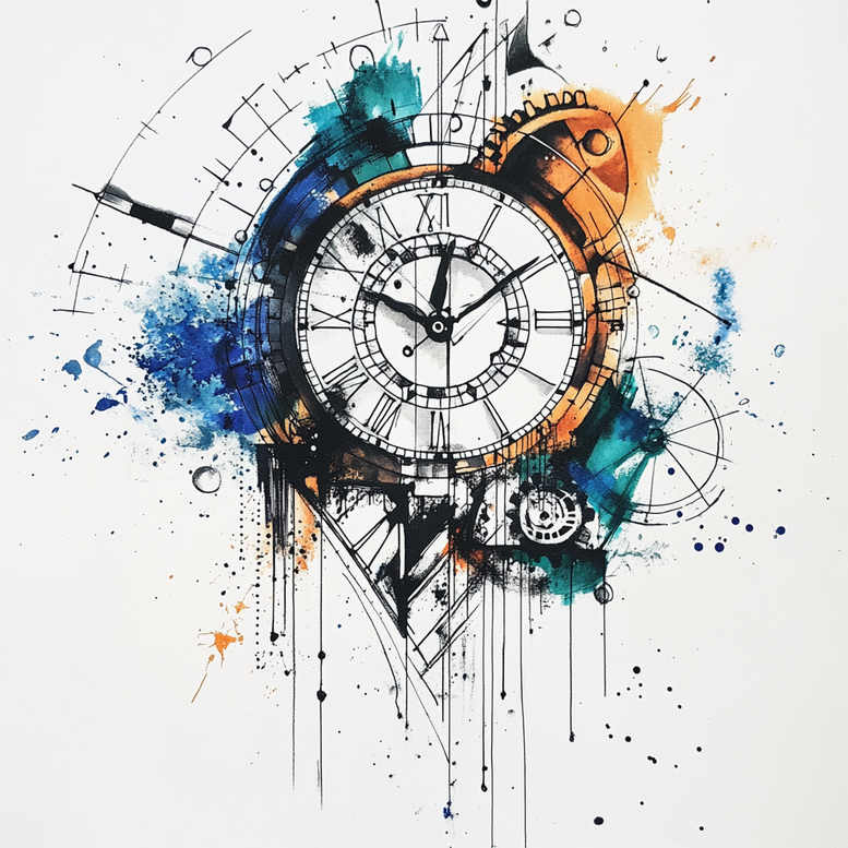This AI-generated tattoo project concept presents a bold watercolor clock centerpiece framed by mechanical gear motifs and crisp geometric lines. The composition fuses precise line work with painterly color washes, placing a circular clock face with Roman numerals at the core while layers of gears hint at movement and time’s inexorable passage. Surrounding elements extend outward as intersecting lines, triangles, and circular tracers, creating pattern-like geometry that dissolves into trailing ink drips and splashes. The color palette pairs cool blues and teals with warm orange accents, allowing the black ink to articulate the clock’s engraving, the gears’ shading, and the network of lines without losing the vibrancy of the watercolor wash. The result is a dynamic piece that reads as both a mechanical study and an expressive art statement, suitable for meaningful tattoos and those seeking a modern, abstract or Japanese-inspired influence in their body art. The design plays with contrast, negative space, and texture to produce a tattoo design that can work well as a standalone statement or as a cover-up where older ink needs bold shape and generous solid areas for concealment. In terms of technique, expect a blend of black and grey shading for depth on the gear and clock elements, with translucent color overlays and dripping lines that give the piece a kinetic feel. Small details such as subtle stippling on metal surfaces and fine line work along the clock’s numerals enhance legibility while preserving the sketch-like quality. As the ink blooms across the page, the composition suggests motion, memory, and the inevitability of change, inviting a viewer to ponder the wearer’s relationship with time and memory. As an AI-generated tattoo project, it embodies contemporary tattoo design language and demonstrates how graphic patterns and watercolor dynamics can translate across skin, while remaining faithful to the idea of time as a recurring motif in tattoo art, ink, and body art. The piece is adaptable to different placements—from forearms to shoulders—and its bold silhouette can accommodate personalized modifications, such as setting the clock to a meaningful hour, adjusting gear counts, or swapping color accents to suit individual skin tones and preferences.