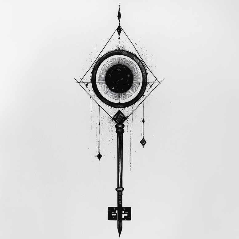 AI-generated tattoo project concept: a geometric eye within a diamond frame anchors a vertical staff, with lines, dots, and small diamonds creating a pattern-rich composition rendered in black and grey linework. The central eye is bold yet delicate, with a solid dark pupil surrounded by fine radial details that suggest depth without heavy shading. A slender staff extends downward, balancing the design while suggesting support and guidance; from the head of the staff, chains and diamond pendants drip along the sides, imparting movement and a sense of fate or ritual. At the tip of the blade at the bottom, a key-like shape hints at unlocking hidden knowledge, turning the piece into a symbolic narrative. The overall effect relies on crisp outlines, subtle stippling, and controlled shading to preserve legibility when scaled, making it suitable for both small tattoos and larger canvases. The composition is a modern geometric take on tattoo design, combining classic symbolisms with a contemporary aesthetic that fits within black and grey, fine line, and pattern-driven work. This tattoo concept can be read as a statement about perception, protection, and access to inner truth, allowing clients to customize the symbols (eye, key, diamonds) to reflect personal meanings. It aligns with meaningful tattoos and custom tattoo design trends, resonating with enthusiasts of Japanese-inspired linework and tribal-influenced symmetry, while offering a clear path for ink that ages well. While this is AI-generated, it serves as a starting point for collaboration with a tattoo artist, who can adapt the motifs to suit placement, scale, and meaning, ensuring a timeless body art piece. As an AI-generated tattoo project concept, this design invites collaboration and personalization.