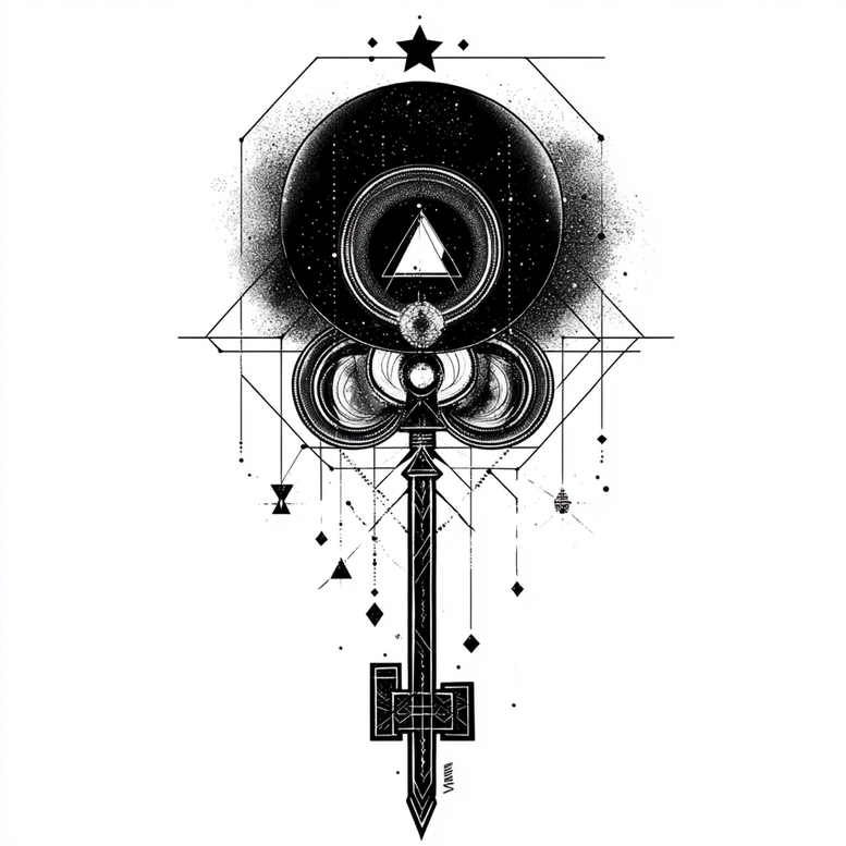 This AI-generated tattoo project presents a bold, black-and-grey geometric design centered on a dagger-like sword plunging downward, its blade flanked by a circular orb and a triangular aperture. Above and around the core, concentric rings, stippled shading, and a web of fine lines form a cosmic scaffold, with diamonds and tapered guides extending outward to create rhythm and depth. The sword’s silhouette offers a sense of protection and decisive direction, while the circle denotes wholeness and cycles, and the central triangle introduces focus and balance. The composition plays with negative space and precise line work to maintain legibility at small scales yet deliver graphic impact as a larger piece; the dense black areas and sparse open space also make it a strong candidate for a cover-up. From a technique perspective, the design relies on controlled line weight, crisp edges, dotwork texture, and geometric alignment to ensure a clean read on skin. In terms of meaning, the symbols converge into a modern interpretation of resilience, unity, and intent—an ideal fit for meaningful tattoos or as a bold body art statement. The pattern-driven arrangement invites customization: you can adjust the scale, reposition elements, or add supplemental motifs within the same geometric framework. This tattoo design borrows from fine line tattoo aesthetics while staying squarely in black and grey, a versatile choice for forearms, calves, or chest panels. As an AI-generated tattoo project, it showcases how algorithmic creativity can translate into durable, aesthetic ink; and for cover-up seekers, its layered geometry offers excellent concealment potential while remaining visually striking. This is a custom tattoo design option meant to inspire personalization and durable body art.