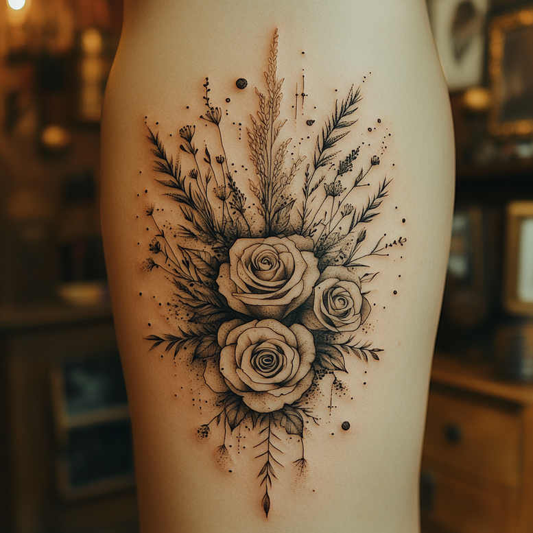 Set against a clean negative space, this tattoo features three roses as the focal point, their petals built with a combination of crisp linework and soft gradient shading to achieve a realistic feel within the black-and-grey spectrum. Surrounding botanicals—long slender blades, fern-like fronds, and tiny seed clusters—radiate outward, guiding the eye and giving the piece its sense of organic motion. The artist employs fine-line technique for the petals and leaves, layered with stippling and subtle dotwork to simulate texture and depth without heavy solid fills. The result is a delicate contrast between bold rose forms and airy botanical accents, allowing the composition to breathe on the leg. The placement will wrap gracefully with the limb’s natural curve, and the vertical alignment can be adjusted to suit thigh or shin areas. The color palette remains strictly black and grey, reinforcing timeless elegance while ensuring compatibility with other ink. The design is intentionally versatile: it can stand alone as a refined floral tattoo design, or serve as a foundational motif for a larger sleeve or leg piece. The symbolism of roses—love, renewal, memory—paired with leafy sprigs communicates growth through adversity, a theme appealing to those seeking meaningful tattoos. From a technical perspective, the piece emphasizes clean line precision, controlled shading, and careful spacing to prevent muddiness over time. If the client desires, the artist can adapt the bouquet’s density, the scale of the sprigs, or the level of stippling to tailor to individual skin type and personal symbolism. This project is presented as an AI-generated tattoo project, highlighting contemporary approaches to botanical ink while maintaining classic floral aesthetics. Keywords such as tattoo, tattoo design, meaningful tattoos, fine line tattoo, rose tattoo design, small tattoos, flower tattoos, custom tattoo design, black and grey, realistic tattoo, body art, and ink are woven throughout to reflect current industry language.