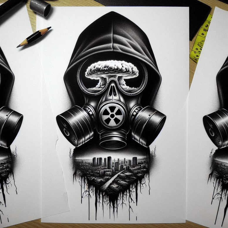 AI-generated tattoo project concept, presented as a black-and-grey realism study, centers on a hooded figure wearing a full respirator mask. The upper visage is framed by a heavy hood, its soft woolly folds contrasting with the mechanical geometry of the gas mask. The mask, with circular filters and precise valves, anchors the composition and creates a focal point that draws the eye downward to the cityscape that dissolves into ink-like cracks. The skyline is rendered with crisp linework and smooth shading, giving depth and a sense of distance while the foreground remains dense with black pigment. The negative space around the hood and mask heightens the dramatic mood, making this a powerful candidate for a cover-up over prior work due to its strong black areas and layered shading. The design plays with light and shadow in a way that mirrors traditional black-and-grey tattoo technique while embracing a contemporary graphic approach. The city below functions as a symbolic anchor: it hints at urban survival, anonymity, and the idea of a hidden world beneath a protective façade. The piece can be adapted to larger canvases or integrated into a sleeve as a centerpiece, and it works well as a standalone statement tattoo design for someone seeking meaningful tattoos with a modern edge. In terms of technique, the artist explores fine line texturing on the mask’s details, bold blocks of black for contrast, and subtle gradients to render the street silhouette, reflecting a fusion of clean Japanese-inspired line work with realist shading. The AI-origin of this project is acknowledged as a digital concept that has been translated into linework that respects the body’s contours and skin tension. It is a strong intersection of urban mythology and industrial aesthetics, suited to those who want a dramatic, cover-up ready piece that communicates resilience.