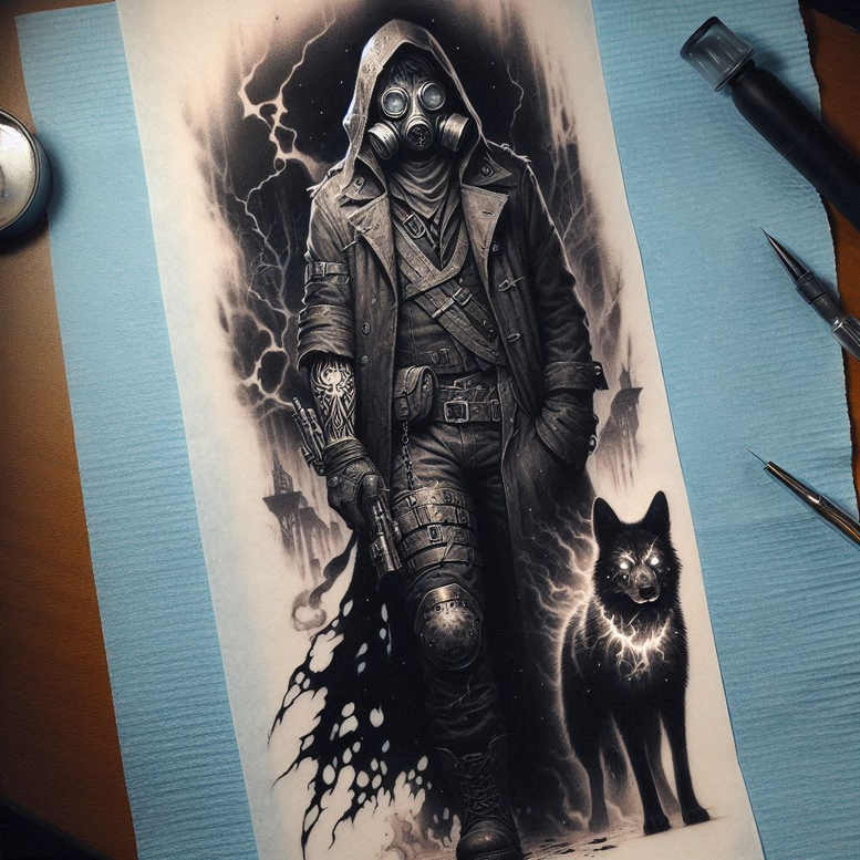 This AI-generated tattoo project concept presents a stark black-and-grey realism, featuring a hooded figure wearing a gas mask, a long trench coat, gloves, and a pistol, accompanied by a black dog. The composition relies on dramatic contrast, deep shadows, and meticulous shading to convey texture—from the slick leather of the coat and the metallic gleam of the mask to the soft fur of the canine and the subtle fabric folds that read as skin on skin. The background suggests storm-light and energy crackling along the edges, rendered through crisp linework and selective negative space to create a cinematic silhouette. The piece demonstrates advanced grayscale technique, including careful feathering, stippling accents, and gradual tonal transitions that hold up at multiple sizes, from small tattoos to larger backpieces. Symbolically, the masked protagonist embodies anonymity, vigilance, and resilience, while the loyal dog evokes protection and companionship, inviting a personal interpretation about loyalty in the face of adversity. For practitioners, the design offers bold black field areas ideal for cover-up applications, enabling existing ink to be obscured while preserving a striking, high-contrast image. As a complete concept, it can function as a strong standalone tattoo design or be adapted into variations—Japanese-style black-and-grey, tribal shading, or fine-line refinements—while remaining anchored in classic noir aesthetics. This concept integrates industry keywords such as tattoo, tattoo design, meaningful tattoos, fine line tattoo, black and grey, realistic tattoo, and ink, and it aligns well with broader themes like infinity, lotus flower, or guardian motifs for personalized meanings. The AI-generated origin underscores a modern approach to body art concepts, inviting clients to explore bold, cover-up-friendly solutions that maintain narrative clarity and legibility across the skin’s surface, making it a compelling starting point for custom tattoo design projects and collaborations in contemporary studio portfolios.