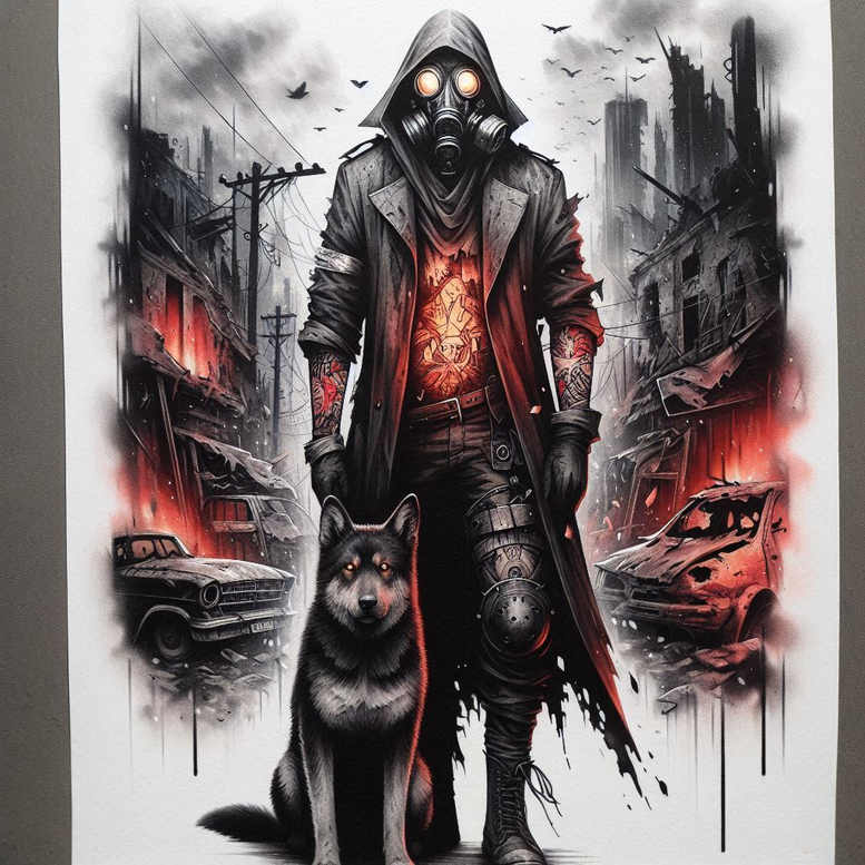 This is an AI-generated tattoo project presented in a high-detail, cinematic black and grey style. The composition centers a man in a long trench coat and hood, his face veiled by a gas mask that glows with a warm amber light. Across the chest, a radiant emblem pulses, hinting at inner power and meaning beneath the urban ruin. At his side sits a loyal wolf, its fur rendered with careful texture and a red leash anchoring the bond. The background unfolds into a devastated cityscape: shattered storefronts, smoke-choked skies, charred cars, and embers that flicker at the margins, all created with spray-like shading and deliberate drips that suggest graffiti and decay. The technique emphasizes fine line tattoo detailing, smooth gradients, bold silhouettes, and a photorealistic yet stylized effect, a realistic tattoo look, suitable for a prominent tattoo design on the shoulder, back, sleeve, or chest. The mood blends post-apocalyptic grit with noir heroism, inviting interpretations around resilience, loyalty, and vigilance. The red leash and ember glow act as anchors for the piece’s color focus, while grayscale supports a timeless tattoo aesthetic. For those seeking meaningful tattoos, the concept translates into a large, cover-up-friendly body art work that can conceal scars beneath a dense field of shadow and texture. As an AI-generated project, it demonstrates how modern tattoo design can fuse narrative storytelling with black and grey realism, offering adaptable cues for custom tattoo design, fine line tattoo, Japanese style tattoo, rose tattoo design, and other ink-ready directions, while remaining suitable for body art and ink applications.