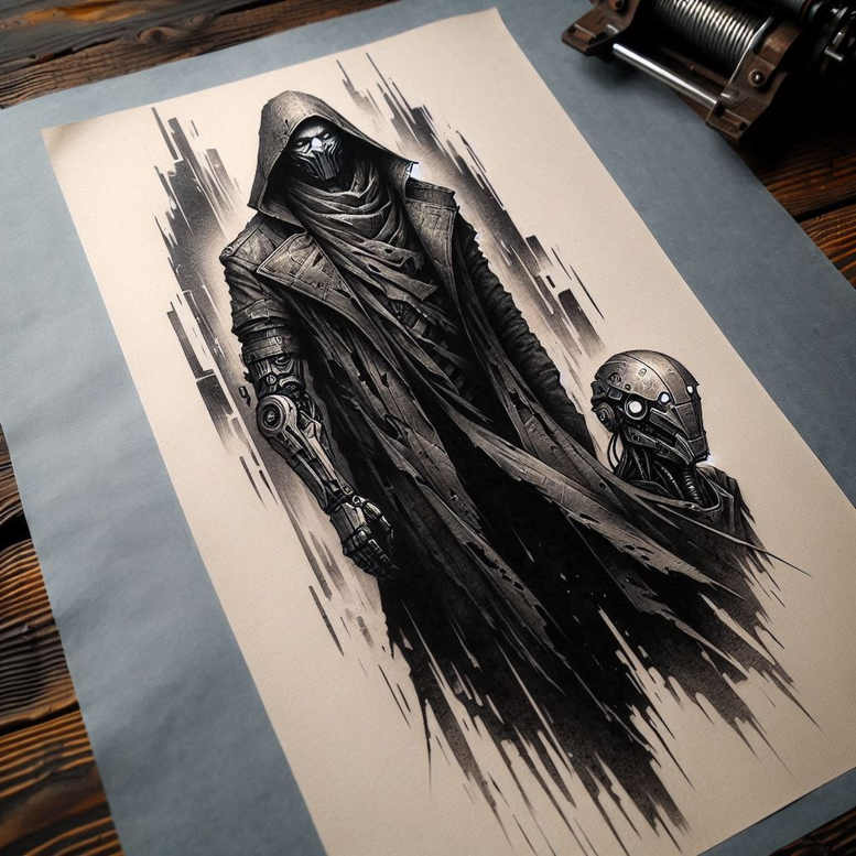 An evocative black and grey tattoo design pairs a hooded figure with a cybernetic companion, rendered in bold linework and rich grayscale. The central wearer is draped in a tattered cloak and layered armor, their face hidden beneath a heavy hood, while a metallic helmeted robot stands at their side, offering a chilling counterpoint of flesh and machine. The background is suggested by jagged cityscape silhouettes, created with sweeping brush-stroke motifs that convey motion and atmosphere without overpowering the main figures. The technique blends dense blacks with mid-tones and precise negative space to produce depth, texture, and a cinematic feel that reads clearly on skin from distance and up close. This tattoo design leans into a modern noir silhouette, with graphic, almost ink-graphic patterns that enhance contrast and contribute to a striking visual rhythm. Symbolically, the hooded figure evokes mystery, guardianship, and resilience, while the cybernetic ally hints at synergy between human will and technology. As an AI-generated tattoo project, it demonstrates how algorithmic ideas can translate into a powerful piece of body art, ideal for a cover-up—the heavy shading and bold silhouettes can mask prior tattoos or blemishes, ensuring a cohesive new image. For enthusiasts seeking meaningful tattoos and statement pieces, this design aligns with black and grey realism, ink depth, and the expansive potential of a large-format back or sleeve, while remaining adaptable to smaller placements. It also nods to Japanese and contemporary cyberpunk aesthetics through restrained grayscale rendering and sharp, angular motifs, delivering a timeless yet futuristic tattoo design that speaks to fans of deep symbolism and bold composition.
