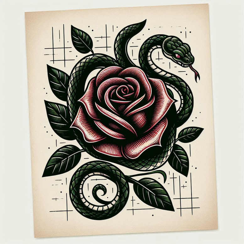 An AI-generated tattoo project concept presenting a rose entwined by a coiled snake, rendered in a bold, classical style with vivid color and precise linework. The centerpiece is a lush rose, petals shaded in deep crimson with delicate white highlights to suggest velvety depth, while a sinuous snake loops around the stem, its scales portrayed in dark greens and pitch black, punctuated by subtle red accents for focal contrast. Leaves orbit the bloom, their glossy surfaces and vein lines echoing the botanical realism of traditional tattoo art. The composition is framed by a minimal geometric grid and discreet stippling, lending structure and motion to an otherwise organic silhouette. This design works well as a standalone tattoo design or as a larger sleeve element, adaptable to upper arm, chest, back, or calf. The technique emphasizes clean outlines, solid fills, and nuanced shading, balancing full color intensity with selective black and grey tonality where appropriate to achieve depth and lifelike texture. In symbolic terms, the rose stands for beauty, passion, and renewal, while the snake signals rebirth, cunning, and resilience; together they convey a message of strength through transformation. The image is dark enough that it doubles as a capable cover-up for older, darker tattoos, with the surrounding negative space used to mask underlying ink and facilitate a seamless rework. As an AI-generated tattoo project, it offers a tangible concept that artists and clients can customize—adding elements such as lotus flower, infinity symbols, or Japanese-style motifs, or translating it into a fine line tattoo or a realistic black-and-grey version if desired. This piece aligns with current trends in meaningful tattoos and bold floral-animal hybrids, delivering a striking body of ink that reads clearly at a distance yet rewards close inspection with intricate line work and color nuance.