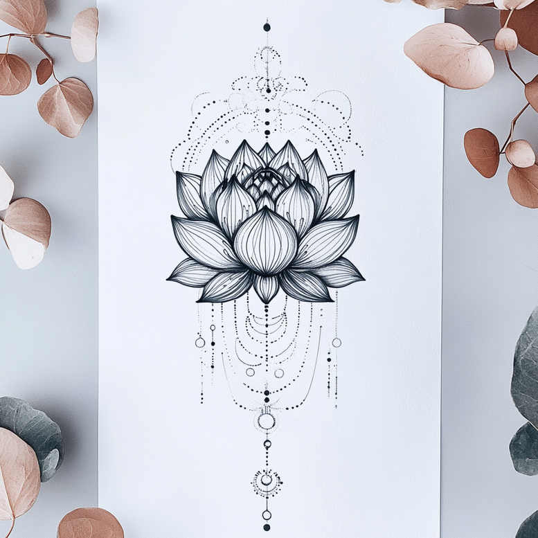 Rendered as a black-and-grey fine-line study, this lotus mandala tattoo design centers on a blooming lotus with multiple symmetry layers, tight petal work, and an extended fringe of dotted lines, beads, and circular motifs that descend like jewelry. The lotus serves as a symbol of purity and awakening, while the mandala framework communicates balance and inward focus. The line weight varies deliberately to create crisp highlights on the petal edges and soft shading within the folds, a technique common in fine line tattooing that yields a delicate, airy appearance on the skin. The composition remains highly adaptable for placement along the spine, inner forearm, or calf, with the central lotus anchoring a vertical flow and the dangling elements offering a natural veil of movement. The dotwork in the fringe provides texture and rhythm, while the circles and arcs echo celestial and cyclical symbolism, suggesting eternity and continuity. As a concept, it integrates traditional elements with contemporary minimalism, aligning well with modern tattoo design trends that favor refined line work and subtle shading. This design is ideal for individuals seeking meaningful tattoos that are elegant yet expressive, suitable for small tattoos or larger pieces depending on scale. In an AI-generated tattoo project context, this concept demonstrates how fine-line motifs and geometric patterns can be harmonized into a cohesive body art proposal; it can be adapted into a realistic black-and-grey execution or expanded with Japanese-inspired or tribal influences for a customized tattoo design.