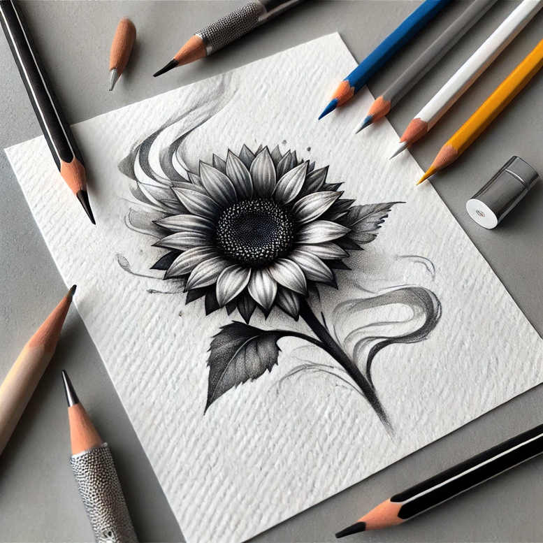This is an AI-generated tattoo project concept, presenting a sunflower rendered in graphite on textured drawing paper. The composition centers on a bold bloom whose petals graduate from cool whites at their tips to deep charcoal along their inner edges, achieved through careful cross-hatching and stippling. The circular disk at the flower’s heart is built with a stippled field that contrasts with the smoother petal shading, giving the illusion of depth and a tactile skin-like texture when translated to ink. A sinuous stem rises from the base, curving to support a single leaf, while wispy, ribbon-like swirls suggest movement within a compact, circular plan. The overall treatment favors black and grey tones, maintaining high contrast without color and lending itself to a realistic tattoo aesthetic as well as fine line or long-lasting body art. As a tattoo design, this concept works well for small to medium placements, and its clean silhouette makes it a strong candidate for a cover-up if the client desires an opaque, nature-inspired cover with generous negative space around the bloom. The sunflower motif carries universal symbolism—growth, resilience, and renewal—making it suitable for meaningful tattoos and personal narratives. The artwork also offers variations such as a lotus flower tattoo adaptation, an infinity tattoo motif integrated into the stem, or a Japanese style tattoo approach with bold outlines and delicate shading. Practically, the drawing translates into a custom tattoo design that highlights black and grey realism, precise line work, and subtle gradations to render petals, leaves, and stems with lifelike texture. While the piece originates as a pencil-study, its intention is to translate seamlessly into skin, preserving the fine line quality and the dramatic contrast that modern black and grey inks rely on, reinforcing the broader concept of flower tattoos and botanical body art across contemporary tattoo trends.