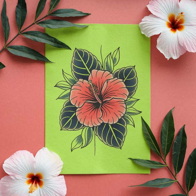 AI-generated tattoo project concept featuring a hibiscus in full color with bold black outlines, set against a lime-green card. The central blossom appears in warm pink-to-coral petals with subtle shading that suggests depth and motion, while surrounding leaves are deep green with lighter venation to emphasize contrast and structure. This design relies on clean, confident line work characteristic of fine line tattoo aesthetics, yet it embraces vibrant color fills that push toward a contemporary floral style. The composition emphasizes a single focal bloom with radiating petals and an integrated leaf motif, making it suitable for a forearm or calf placement depending on scale. The bright background not only enhances readability on skin but also informs ink choices for a lasting, vivid result. While the piece reads as a self-contained floral study, its crisp motif and graphic silhouette translate well into meaningful tattoos, symbolizing growth, resilience, and beauty. The hibiscus is a universal symbol of delicate feminine energy and hospitality, often used in flower tattoos to convey joy, renewal, and the ephemeral nature of life; paired with a bold outline, the design reads as a statement piece, yet remains versatile for small tattoos or larger body art expansions. The use of color blocking and sharp contrast demonstrates how a jewel-like palette can maintain legibility in black-and-grey or full-color renditions, aligning with trends in Japanese style tattoo and modern tribal-inspired timelines, while still nodding to classic rose tattoo design motifs through its central bloom. For practitioners, the concept offers a platform to explore custom tattoo design workflows, from refined line density and negative space planning to ink selection and shading strategies. This is an AI-generated tattoo project concept, intended to explore how crisp line work and bright hues interact on skin, with emphasis on pattern-friendly composition and the potential for a larger piece, while also providing a template for small tattoos and flower tattoos across genres.