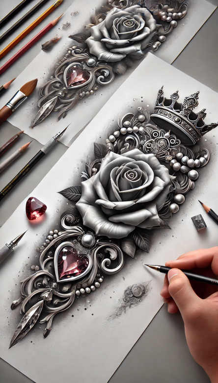 AI-generated tattoo project concept featuring a bold black-and-grey rose crown centerpiece, framed by ornate scrollwork. The primary elements are a lifelike rose and a jeweled crown, complemented by curling filigree, pearl beads, a heart-shaped gem, and stylized leaves. Rendered in grayscale with smooth gradients, crisp line work, and stippled shading, the piece achieves depth and tactile texture while preserving readability as a tattoo design at various sizes. The rose symbolizes love, resilience, and renewal; the crown conveys authority, achievement, and personal sovereignty; the scrollwork evokes antique jewelry, while the pearl beads and heart gem imply memory and sentiment. The repeating pattern in the scrolls provides visual movement and rhythm, giving the composition a cohesive flow from top to bottom. Though conceived as a single-panel motif, the layout can be adapted to a sleeve or back piece, making it a meaningful tattoo design for those seeking a bold black and grey statement. The concept blends realism with fine-line detailing in the petals and jewelry-like accents, achieving a balance between strong contrast and subtle gradation. It lends itself to a wide range of applications—from small tattoos to large body art—while remaining suitable for custom tattoo design that respects anatomy and skin tone. AI-generated origin: this is an AI-generated tattoo project intended to inspire studios and clients, with a timeless rose motif and regal symbolism that also reads well as a cover-up when covering older ink.