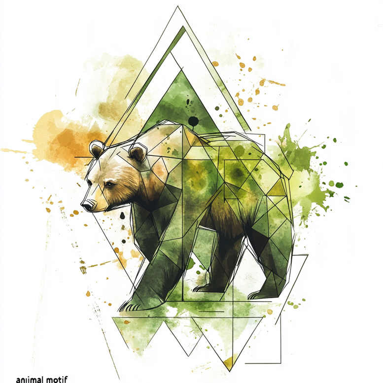 AI-generated tattoo project concept presents a geometric bear rendered in a luminous blend of watercolor greens and yellows. The central figure is built from interlocking triangles and polygon facets, creating a modern, pattern-rich silhouette that reads both living creature and abstract sculpture. The bear’s head turns slightly to the left, with soft shading in browns and tans that ground the composition while the body dissolves into crisp line-work and translucent washes. The piece balances bold black outlines with airy fills, allowing negative space to breathe and giving the geometry room to breathe as it transitions from animal form to geometric mosaic. Layered watercolor washes in chartreuse, olive, and lime greens cascade across the torso, contrasting with ochre and amber accents that give warmth to the fur. The surrounding shapes—triangles within triangles and overlapping rhomboids—function as a deliberate motif, reinforcing the idea of transformation and strength. Although the palette is vivid, the design remains legible at smaller scales, making it suitable for small tattoos as well as larger back or sleeve projects. The concept leans toward a contemporary tattoo design rather than traditional, drawing on elements of Japanese style tattoo geometry and modern line-work to produce a black and grey-leaning but color-rich piece. The symbolism centers on resilience, nature, and the fusion of organic form with precise geometry; the bear embodies courage, while the fractured facets suggest complexity of identity. As a custom tattoo design, this work speaks to those seeking meaningful tattoos that blend nature motifs with graphic pattern, and it demonstrates how watercolor washes can coexist with fine line geometry to create a striking body art statement. For readers exploring pattern-heavy tattoos, this concept demonstrates how polygonal structure can carry skin-friendly composition across fab greens and yellows, still preserving legibility from distance. Note that this is an AI-generated tattoo project concept, underscoring its synthetic origin while delivering a professional design direction for clients and artists.