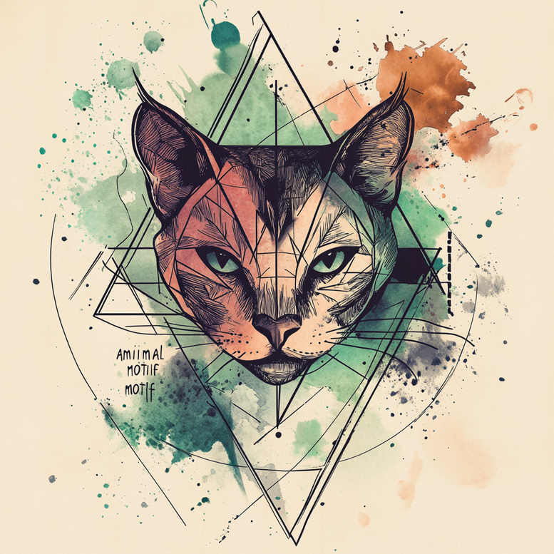AI-generated tattoo project concept blending geometry with a feline portrait. The centerpiece is a cat head drawn with clean, fine-line contours and a structured lattice of triangles and circular frames that intersect across the face, creating a modern geometric composition. Behind and around this geometry, watercolor splashes in teal, emerald, and warm coral tones provide a counterpoint to the linear precision, giving the piece energy without overpowering the subject. The black line work remains crisp to preserve legibility on skin, while the color washes are applied with a semi-transparent hand to maintain contrast and aging gracefully over time. The composition balances negative space with dense detailing in the eyes, nose, and whiskers, inviting close inspection of how shape, shade, and line interact. From a technical standpoint, the design translates well to a variety of placements, offering a robust scaffold that holds up for large pieces and can be adapted for smaller versions as a fine-line tattoo. The concept also reads as a potential cover-up, thanks to its dense line work and high-contrast areas that can mask underlying marks when configured by an experienced tattoo artist. Symbolically, the cat embodies independence, curiosity, and nocturnal grace, while the geometric framework communicates balance, order, and a contemporary sensibility. This project leans toward a modern interpretation of Japanese style tattoo with careful line quality and a disciplined composition, suitable for fans of small tattoos, yet scalable to bolder body art. Although the palette is vivid, the concept remains adaptable to black and grey versions should a client request a more subdued look. It is explicitly described here as an AI-generated tattoo project concept, offering a fresh, technologically informed approach to ink, meaningful tattoos, and the evolving language of tattoo design. Keywords such as tattoo, tattoo design, meaningful tattoos, fine line tattoo, lotus flower tattoo, infinity tattoo, tribal tattoo, rose tattoo design, small tattoos, flower tattoos, custom tattoo design, Japanese style tattoo, black and grey, realistic tattoo, body art, and ink guide the narrative and reflect the breadth of options this concept invites.