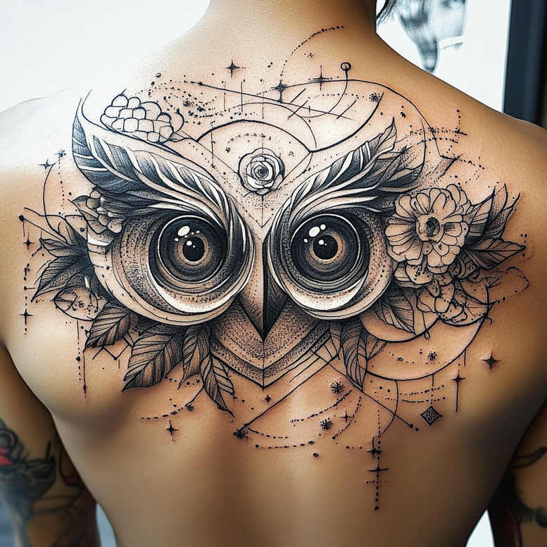 AI-generated tattoo project concept presenting an intricate back piece: a central owl with large, reflective eyes rendered in layered feather detail, framed by blossoms and leaves, all threaded through geometric arcs, dots, and linework. The design fuses black and grey shading with fine-line precision to convey depth, texture, and a sense of motion across the shoulder blades. The owl’s gaze anchors the composition, while the surrounding florals provide natural contrast and serve as a lush frame. Geometric patterns and stippled accents weave through the piece, giving it a modern, pattern-rich aesthetic that reads as both botanical and architectural. The technique relies on clean outlines, smooth gradients, and micro-shading to achieve a realistic yet stylized black-and-grey look that translates well across a broad canvas or as a contained back tattoo. For those considering a cover-up, the density of dark ink and the layered linework offer a solid foundation for concealing older work while presenting a sharper, more contemporary image; the pattern elements help integrate existing tattoos with the new design. This concept embodies a contemporary tattoo design: bold, durable, and versatile, with the potential to anchor personal narratives in a single, cohesive tattoo project. It also demonstrates how AI-generated concepts can inform high-quality tattoo art while remaining mindful of skin tone, placement, and longevity. The blend of botanical motifs with architectural geometry invites close inspection, and the owl’s silhouette offers timeless symbolism of wisdom and protection. The pattern-work implies movement and continuity, preserving readability even when scaled down, making this a versatile choice for back coverage, meaningful tattoos, and modern body art.