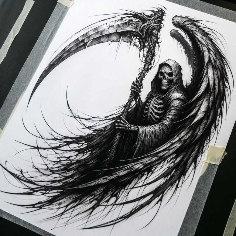 An AI-generated tattoo concept, this stark black-and-grey illustration centers a Grim Reaper skeleton wearing a hooded robe, clutching a sweeping scythe as formidable wings unfold behind. The design relies on flowing linework and bold silhouettes, with deliberate negative space that preserves legibility on skin at various sizes. Fine-line strands weave through the robe and wings, creating a dense, pattern-rich surface that reads clearly from a distance yet rewards close inspection with subtle texture. The scythe arcs dramatically, injecting motion into the composition while the skeletal face maintains the timeless symbolism of mortality and fate. Monochrome shading builds depth and contrast, producing a crisp, high-contrast tattoo design that translates well to black-and-grey realism. Intended as a versatile concept for large canvases—back, chest, or sleeve—it also makes a strong cover-up option due to its heavy ink density and layered rendering that can conceal older tattoos. The piece speaks to meaningful tattoo themes—life, death, resilience—and can be adapted toward Japanese-style line work or traditional realism depending on the artist’s vision. For collectors seeking a striking graphic, the winged silhouette provides dramatic symmetry, while the pattern-like lines support a compelling focal point. While AI-generated, this concept functions as a robust starting point for a custom tattoo design and highlights cover-up potential as a core strength, offering a powerful, narrative-driven body art piece.