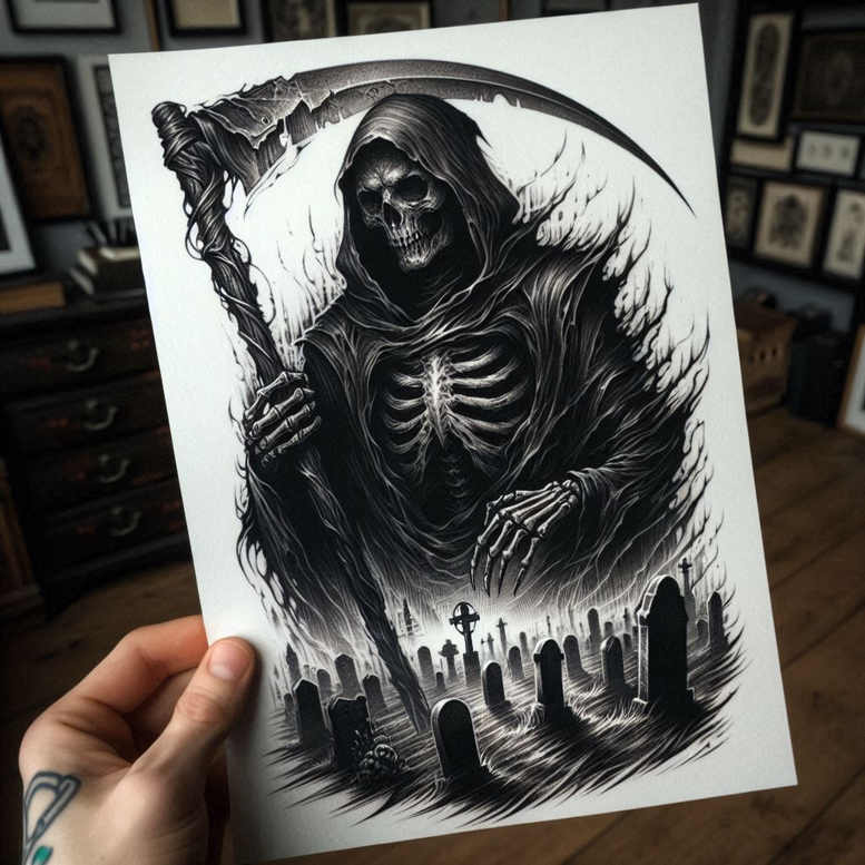 AI-generated tattoo project presents a towering Grim Reaper figure, hooded and skeletal, gripping a curved scythe as it looms above a desolate graveyard. Rendered in black and grey with dense cross-hatching and sweeping linework, the composition relies on rich tonal contrasts and deliberate negative space to create depth and drama. The cemetery foreground is populated by headstones and crosses that recede into a foggy horizon, while the reaper’s robe is textured with fine lines that imitate fabric folds and wind, lending a sense of motion to a still scene. This piece blends traditional dark-ink techniques with modern vector-inspired shading to achieve a bold, readable silhouette that remains legible when scaled up or down. As a tattoo design, it conveys themes of mortality, fate, and tenacity, making it a strong option for meaningful tattoos or as a cover-up solution for older marks that require concealment under a striking new image. The graphic nature of the scene benefits from black and grey ink to preserve crisp outlines over time, with emphasis on the scythe blade, skeletal features, and the varied textures of the robe and tombstones. In terms of style, the work leans toward realistic shading and high-contrast silhouette work, suitable as a standalone piece or integrated into larger body art projects. For practitioners, the concept offers flexibility in scale and density: tight fine line tattoo details can be retained in a smaller piece or amplified for a back piece while maintaining legibility of key elements. This AI-generated tattoo project demonstrates how modern algorithms can inform traditional tattoo artistry, delivering a ready-to-ink concept that honors classic motifs—Grim Reaper, scythe, and cemetery—while inviting personalization through line density, texture, and placement. It’s well suited for meaningful tattoos, and can be adapted across styles, from Japanese style tattoo to black and grey realism, and even into motifs like lotus flower tattoo, infinity tattoo, tribal tattoo, rose tattoo design, or small tattoos, depending on taste and placement, ensuring a timeless, impactful result for body art and ink.