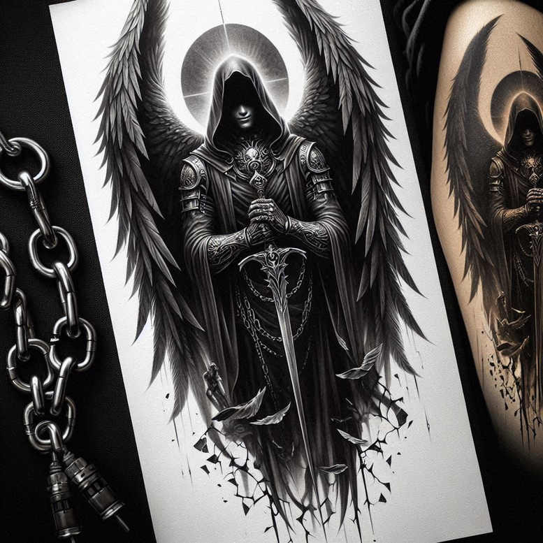 AI-generated tattoo project. This piece presents a hooded, watchful guardian in black and grey, an armored figure standing solemnly with a sword planted before it. Massive wings spread behind, their feathers rendered with meticulous shading that creates a dramatic contrast against the hooded silhouette. A halo glows behind the head, enhancing the composition with a celestial touch while the robe and ornate armor feature intricate filigree, rivets, and chains that drape across the figure, giving a sense of weight and gravity. The base design appears to dissolve into fragments and shards, suggesting themes of endurance, rebirth, or emergence from darkness, and inviting personal interpretation. The entire scene relies on bold grayscale gradients and fine line work to achieve depth, texture, and a lifelike feel within a single cohesive tattoo design. As a cover-up-ready concept, the densely packed ink and layered shading are ideal for concealing prior work, while preserving a striking silhouette that remains legible on larger body areas or can be adapted to smaller placements without losing its impact. The technique emphasizes smooth transitions between light and shadow, with careful attention to the armor’s ornamentation, the chain details, and the wing structure that frames the central blade and halo. Symbolism leans on protection, vigilance, and inner strength, suitable for meaningful tattoos or personal mantras. This AI-generated tattoo project aligns with trends in realistic black and grey ink and can be expanded into Japanese style tattoo or fantasy realism interpretations, while still being adaptable to traditional ink workflows. For artists and clients alike, the design offers a bold, timeless body art option that reads from a distance yet reveals nuanced micro-detail upon closer inspection, and it carries the potential to become a signature piece in a larger sleeve or chest composition. In summary, it is a pattern-rich, high-contrast composition that embodies a powerful guardian motif, perfect for a cover-up and compatible with various ink techniques, from fine line accents to broad shading, ensuring a durable, meaningful tattoo design that stands the test of time.