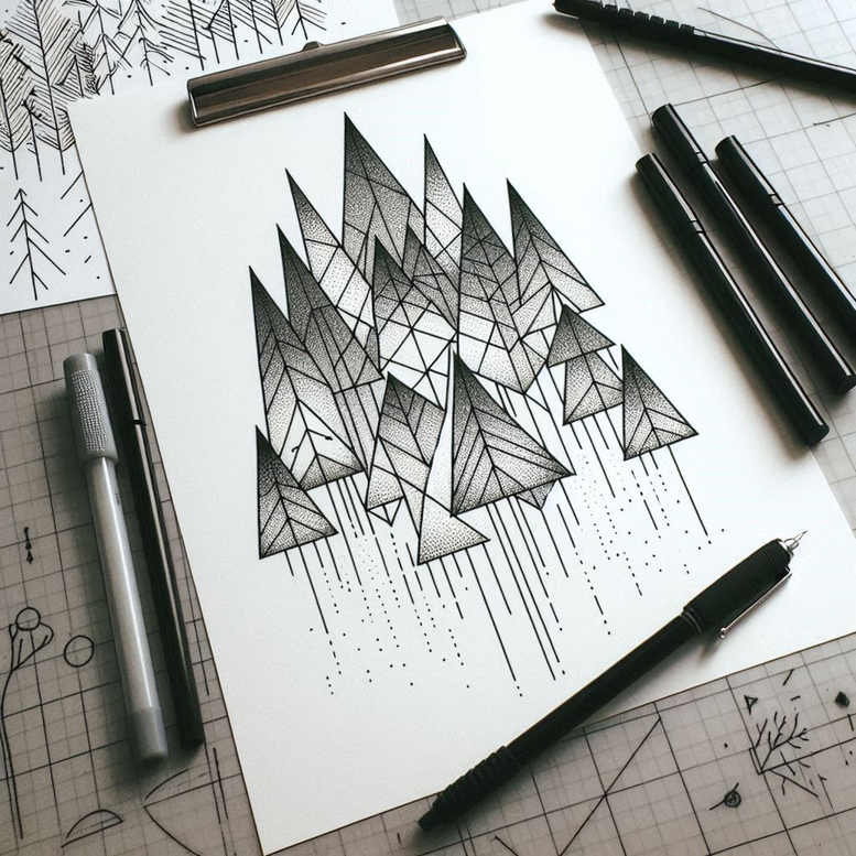 AI-generated tattoo project presents a geometric mountain mosaic composed of interlocking triangles rendered in black and grey ink. The composition reads like a jagged range, with each triangle subdivided by crisp hatch lines that create tonal variation without heavy shading. The eye follows a central ascent from lower clusters to sharper peaks, while trailing vertical lines and scattered dots suggest rain or snowfall, lending movement and atmosphere. The motif relies on repetition and precision: a lattice of triangles, varying in size and orientation, forming a cohesive whole that feels both architectural and organic. The patterning emphasizes rhythm, making it an ideal candidate for a larger sleeve or back piece, yet adaptable as a smaller tattoo through selective scaling. The style sits firmly in black and grey, with fine line tattoo technique that preserves negative space and clarity over time, ensuring longevity on skin. While the concept is rooted in geometric patterning, the design evokes natural forms—mountains, shards of rock, or crystal facets—allowing the wearer to imbue personal symbolism, such as resilience or ascent. In terms of technique, the work relies on dense line work, even spacing, and controlled stippling to achieve tonal depth without gradients; the result is a crisp, high-contrast tattoo design that remains legible at various sizes. The image documents an AI-generated tattoo project exploring how geometric facets can translate into meaningful body art. For clients seeking a modern, minimal yet striking look, this design offers a balance between precision and artistry, suitable for small tattoos or larger, continuous flows. The overall message is one of clarity and ascent, with the triangles pointing upward as a metaphor for growth, while the patterned texture underscores the idea of complexity emerging from simple elements. Other potential motifs to consider in a custom tattoo design include lotus flower tattoo and infinity tattoo influences, but the current draft keeps to a monochrome palette and disciplined execution that respects body contours. Finally, as a study in geometry and line work, this piece aligns with trends in fine line tattoo, black and grey tattoo, and pattern-focused body art, making it a versatile option for tattoo collectors seeking a contemporary, meaningful design.