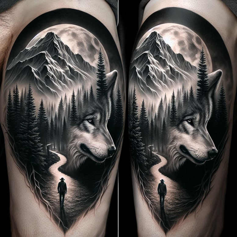 This AI-generated tattoo project presents a dark, cinematic black and grey realism scene where a majestic wolf head dominates the foreground, while a pine forest and snow-capped mountains recede into a moonlit distance. A winding path leads a lone traveler toward the woods, providing scale and a narrative of journey, resilience, and personal rite. The wolf’s fur is rendered with fine line precision and smooth grey shading to achieve a lifelike texture, while the trees are sculpted in crisp silhouettes that contrast against the misty mountains. The moon casts a cool glow, lending depth to the composition and highlighting key details on the wolf’s snout and the tree needles. The overall design relies on careful contrast between solid black areas and delicate grey transitions, producing a powerful, timeless tattoo design in black and grey that suits large placements on the upper arm, shoulder blade, or thigh. Symbolically, the wolf embodies guardianship and instinct, the forest hints at mystery, and the mountains signify endurance—together forming a meaningful tattoo about courage and the journey through life. Being AI-generated, this concept can be tailored to client measurements and placement, and the heavy shading makes it an excellent option for cover-up projects if worn over older work. For fans of realistic animal and landscape tattoos, this piece delivers a striking, story-rich image in a classic black and grey palette, aligning with modern trends in body art and ink quality.