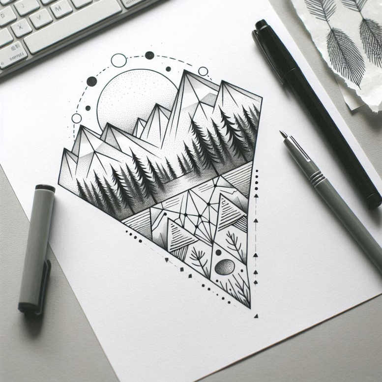 Geometric mountain forest is rendered in black and grey using a crisp fine-line tattoo technique. The central motif features a jagged mountain range crowned by a dense row of pine trees, with a circular sun implied behind the peaks, all drawn in precise contour lines. The lower portion flows into tessellated triangles and geometric panels, each field shaded with stippling and cross-hatching to build texture and depth while keeping the overall image light enough for longevity in black and grey ink. The negative space around the landscape enhances legibility on skin and allows the design to scale gracefully from small wrist tattoos to larger back pieces. The composition fuses natural landscape imagery with geometric rhythm to create a contemporary tattoo design that reads as landscape and abstract pattern at once. Symbolically, mountains stand for endurance and exploration, forests for growth and resilience, and the sun for renewal and clarity; together they tell a personal story of journey and transformation. For collectors seeking meaningful tattoos, this concept offers a versatile starting point for a custom tattoo design that can be adapted to placement such as forearms, calves, or shoulders, and configured for a sleeve with complementary motifs if desired. As an AI-generated tattoo project, it demonstrates how algorithmic creativity can inspire body art while preserving the crisp line work and balance essential to fine-line techniques. The pattern-rich triangle field adds visual intrigue without sacrificing legibility, making the piece appealing in both single-needle black-and-grey and denser shading styles. The design is modular, so a tattoo artist can adjust line density, dot-work, and panel composition to fit anatomy while keeping the central narrative intact. Both minimal and bold versions are possible; the concept can also accommodate additional symbols like a lotus flower tattoo element or an infinity motif to deepen meaning, while maintaining the geometric discipline that defines this tattoo design. In short, this is a robust foundation for a custom tattoo design that celebrates nature, geometry, and personal symbolism through precise line work, pattern, and contrast in black and grey ink.