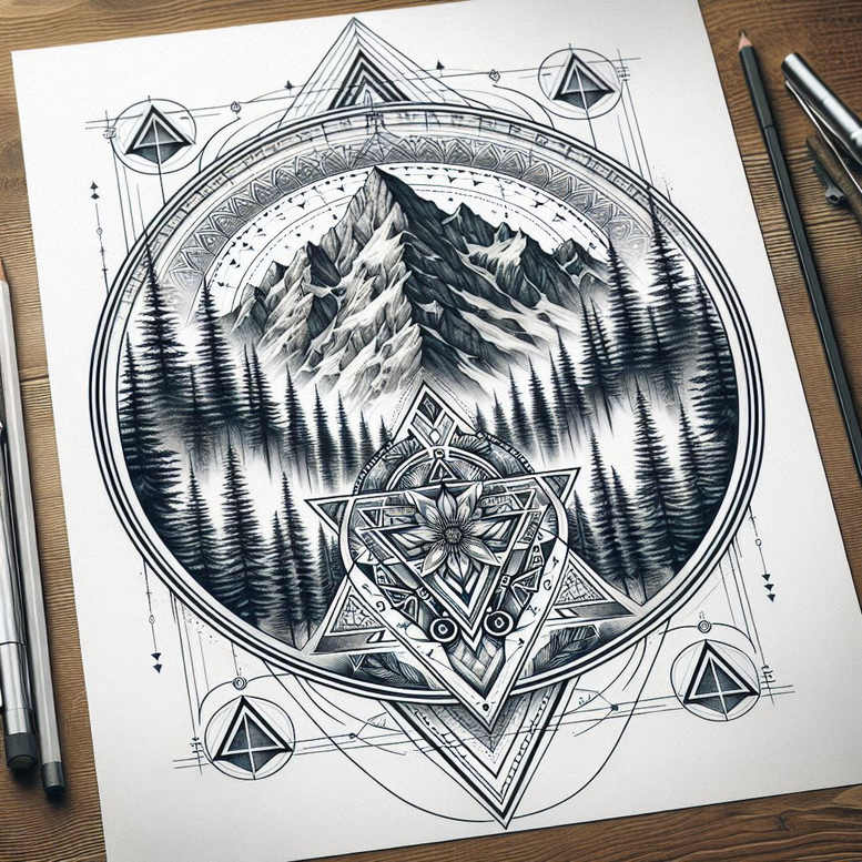 An AI-generated tattoo project concept featuring a circular mandala scene that encapsulates a rugged mountain landscape and a dense pine forest. The composition rests inside a double circular frame, with an intricate layer of geometric motifs and triangles that echo classic mandala patterning. The mountains are rendered with fine line shading and high contrast black and grey ink, tapering to slender pines that create a sense of depth along the circle’s edge. At the center, a layered triangular emblem overlays a bloom-like motif, combining symmetry and organic detail to form a striking focal point. The overall design blends realism of the alpine landscape with geometric precision, inviting a large-scale placement or a refined small tattoo depending on the client’s preference. The piece reads as a tribute to endurance and solitude, with the pine forest symbolizing resilience and the mountains representing ascent and overcoming obstacles. Given its dense black shading and interconnected lines, this concept is especially well-suited for a cover-up, allowing existing marks to be concealed beneath the bold circular frame and patterned geometry. Techniques to consider include smooth gradient black and grey shading to create depth in the mountains, crisp line work for the circles and triangles, and dotwork for the forest texture to achieve a cohesive yet striking finish. The design embraces broader tattoo vocabulary—fine line tattoo, black and grey, realistic tattoo elements—while remaining adaptable to a custom tattoo design catered to the client’s skin tone and anatomy. If expanded, this concept could integrate lotus flower tattoo elements or infinity motifs into the central geometry for a personal meaning, or be transformed into Japanese style tattoo influences with wind-swept pines, and even flower tattoos for a softer contrast. As an AI-generated tattoo project, it offers a robust starting point for artists seeking a bold, pattern-rich piece that remains versatile for placement on the upper arm, back, or chest. Beyond aesthetics, the piece can symbolize perseverance, nature’s majesty, and the journey within, providing meaningful tattoos and tattoo design options for clients seeking small tattoos that scale into a statement piece.