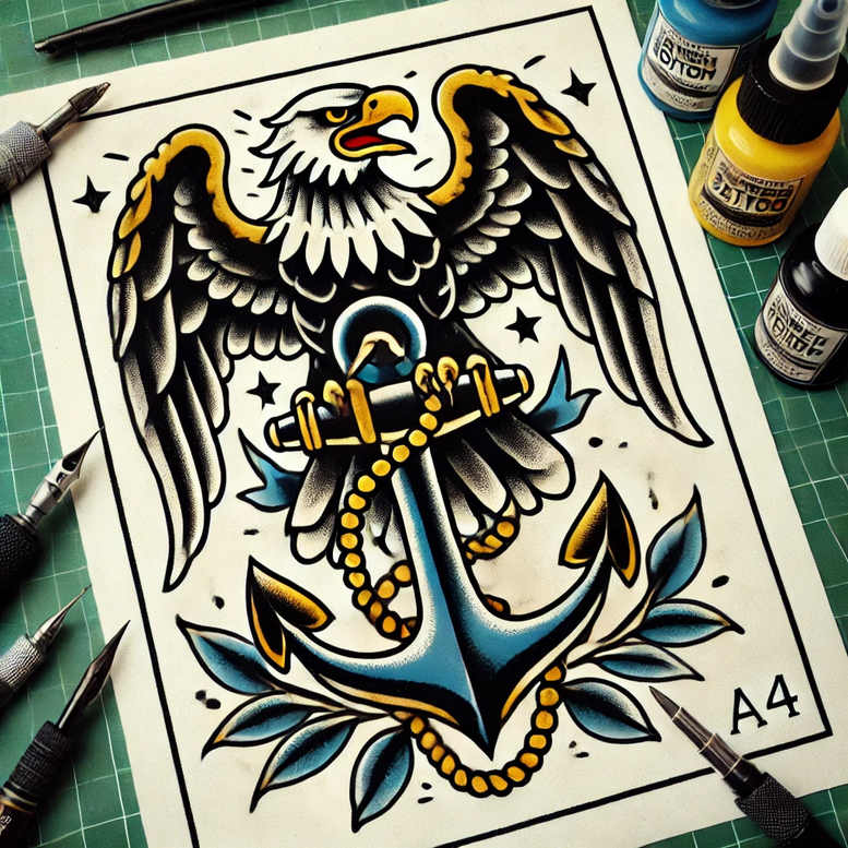 This tattoo design centers on a traditional American motif: a proud eagle perched above a sturdy anchor, with a rope looping around the frame and gold bead accents. The eagle is rendered in black and grey with crisp white highlights to emphasize plumage and intensity, while the anchor is saturated in a vivid blue that contrasts with the muted tones of the bird. A secondary blue ribbon-like flourish threads through the composition, and a string of golden beads drapes over the shank to add brightness and movement. Surrounding elements are simplified leaf shapes in blue, providing a natural counterpoint to the nautical symbolism. The composition relies on bold outlines and solid-filled areas, followed by smooth gradient shading to create depth without losing legibility at small sizes—a hallmark of traditional tattoo technique. The overall balance between solid black ink, cool blues, and warm gold lends a contemporary edge to a timeless iconography, making it suitable for a forearm or upper-arm placement where the silhouette remains clear with motion implied by the rope. As a concept, this piece demonstrates how classic symbols—eagle for courage, anchor for steadfastness—translate into a cohesive tattoo design with meaningful symbolism for the wearer. The design also serves as a strong example of color-forward traditional tattoo design, combining black and grey shading with selective color to achieve contrast and legibility on skin. AI-generated tattoo project concept; the imagery is crafted to appeal to those seeking bold, statement-making body art that remains versatile for future cover-ups and edits; in this sense, it functions as a modern interpretation of nautical Americana. Keywords woven through the description include tattoo, tattoo design, meaningful tattoos, fine line tattoo, lotus flower tattoo, infinity tattoo, tribal tattoo, rose tattoo design, small tattoos, flower tattoos, custom tattoo design, Japanese style tattoo, black and grey, realistic tattoo, body art, ink.
